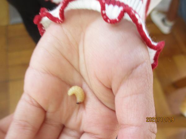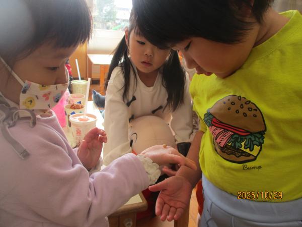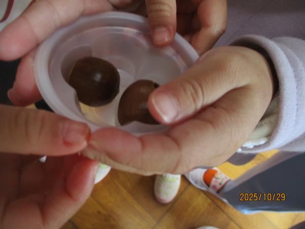 部屋遊び用のどんぐりからは、かわいいお友達が「こんにちは💖」。「ふわふわしてる~☺」「かわいいねー💓」と興味津々で触ったり観察したりしていました😊どんぐり虫さんの出てきた穴も探していましたよ😄