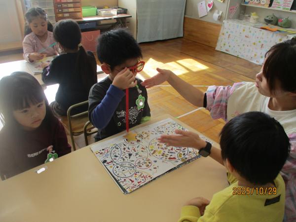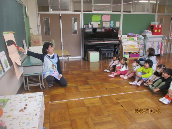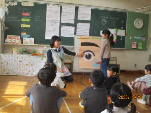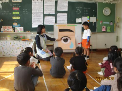 10月10日の“目の愛護デー”にちなんで、「目を大切にしよう」というテーマで保健指導を受けました。皆さん、まつ毛って一つの目に何本生えていると思いますか?!覚えたてほやほやのこどもたちに聞いてみてください👀✨