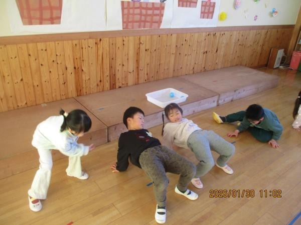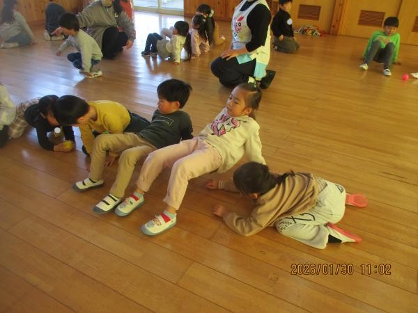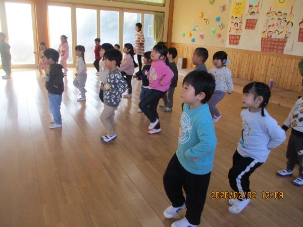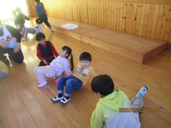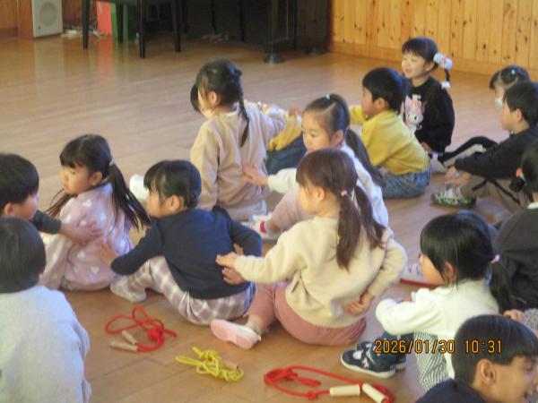 みんなでかっこいい姿勢になるための体操にも挑戦しました✨縄跳びを使ってストレッチをしたり、体幹を使ってバランスをとったりしました🎶幼稚園生活でもたくさんの運動遊びをして、よい姿勢でいるための筋肉を少しずつ育てていきましょうね🙌