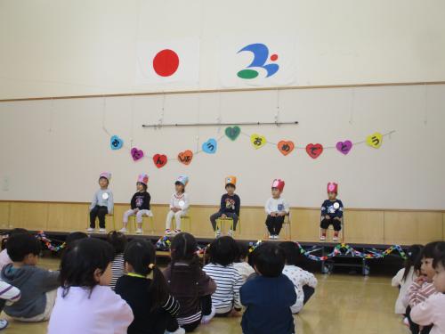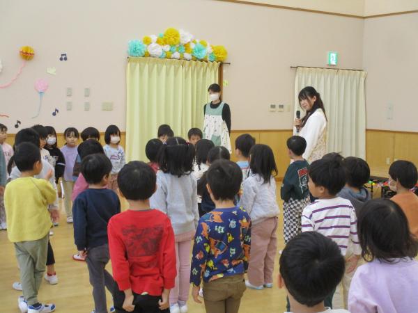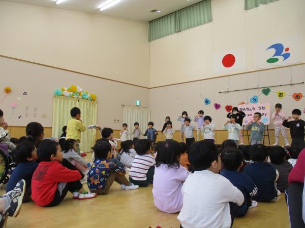 今日は11月の誕生会がありました🎂誕生児のお友達は、入場前はワクワク・ドキドキしている様子でしたが、ニコニコ笑顔でアーチをくぐる姿が見られました☺✨司会はつき組、アーチはたんぽぽ組、質問コーナーはすみれ組のお友達が担当してくれました💓質問コーナーで、好きなお菓子を聞くとと、「キャンディーが好きです🍬」「ポテトチップスが好きです🥔」などと上手に教えてくれました!そして今月の出し物では、年長さんが英語の歌「I‘m so happy」を発表してくれました🎶大きな歌や振り付けで歌っている年長さんを見て、「かっこよかった💗」「楽しい気持ちになった😄」と年少さんや年中さんが感想を言っていましたよ💕来月の誕生会も楽しみだね🥰