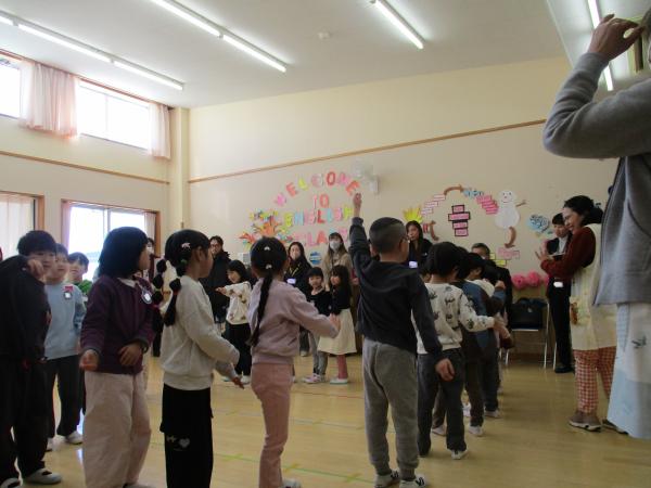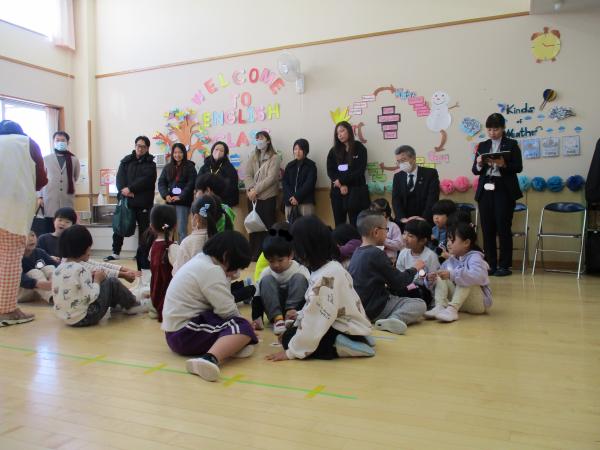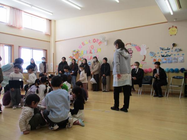 年長さんは、英語教室自由参観1日目がありました。今日は、お家の方と宮崎県日向市の教育長さんをはじめとしたお客様も来園し、たくさんのお客様を前に、ちょっぴりドキドキしていたつき組さんでしたが、レッスンが始まると普段どおり元気いっぱい、自信をもって英語を楽しむことができました。