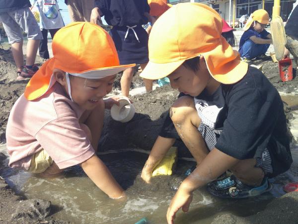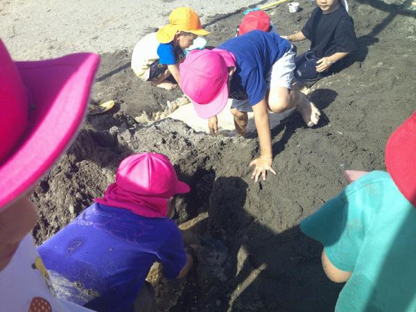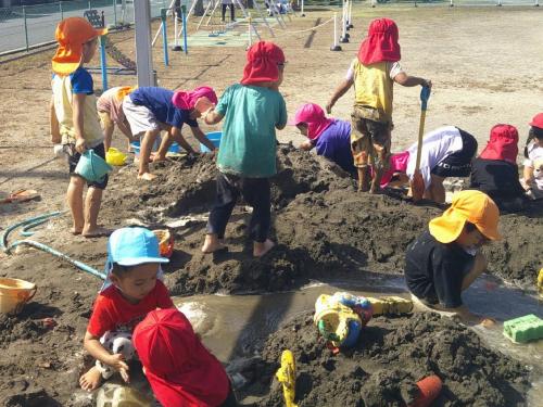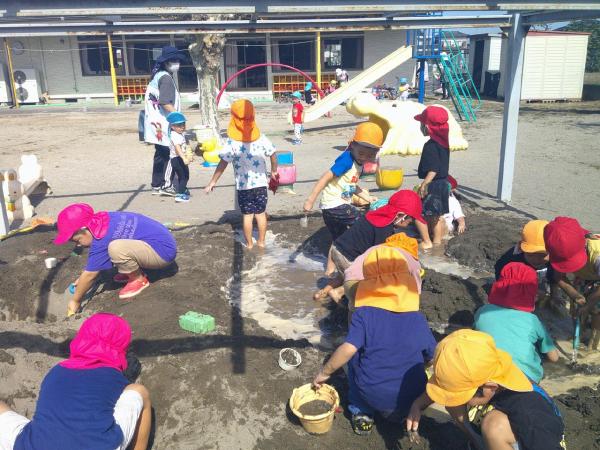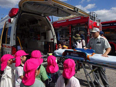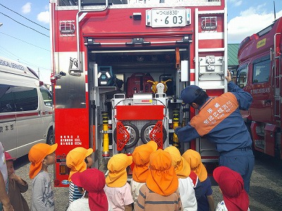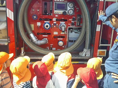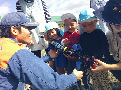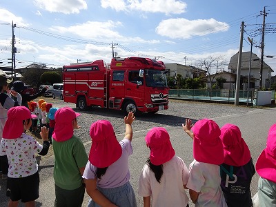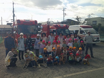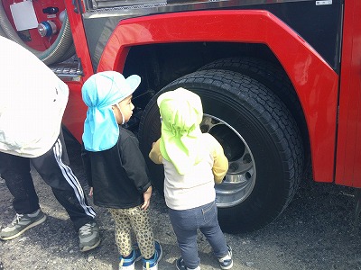 消防署指導の避難訓練があり、消防車と救急車が保育所にやってきました!