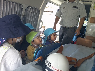 お話後は、みんなが楽しみにしていた消防車と救急車の見学!よーく見て、気になったことはたくさん質問して、救急車に乗せてもらったり、帽子やヘルメットをかぶせてもらったりと、なかなかできない貴重な体験をさせてもらいました✨
