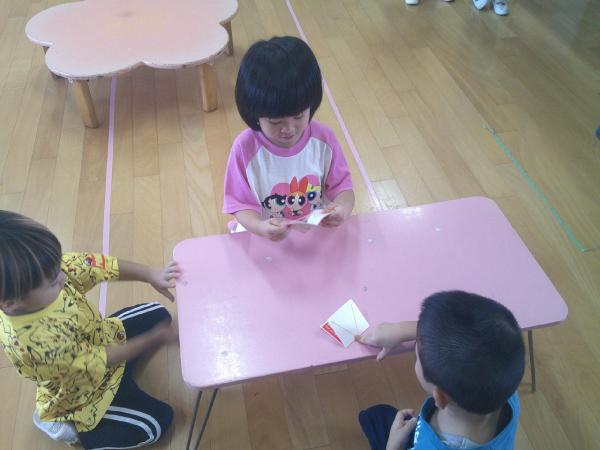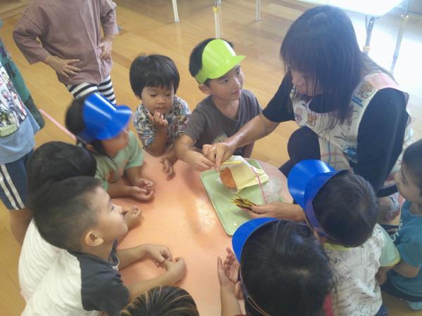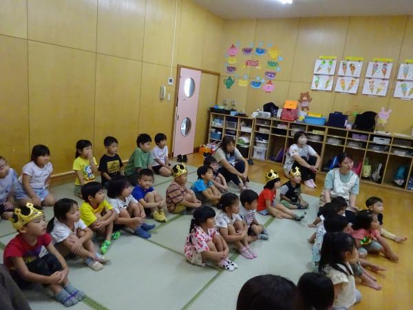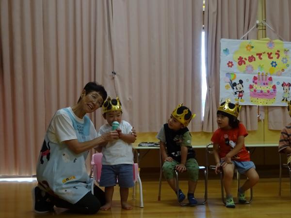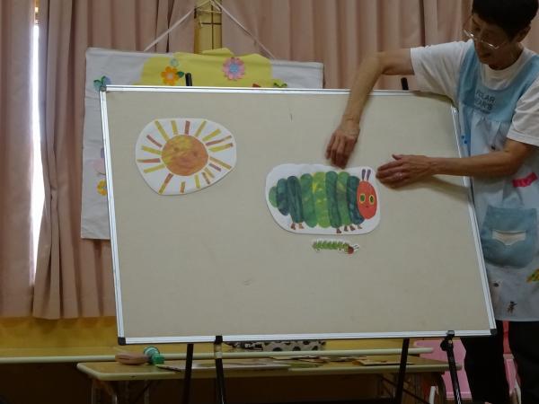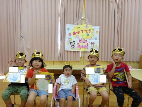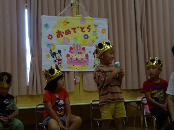 名前と何歳になったかをみんなの前で緊張しながらも頑張って発表していました✨「好きなフルーツはなんですか?」という質問に「バナナです🍌」「梨です」と好きなものを教えてくれました。「好きなジュースはなんですか?」の質問では、「メロンソーダです」「オレンジジュースです」とそれぞれ好きなものを教えてくれました。ひよこ組のお友だちもマイクをもって答えてくれましたよ♡『はらぺこあおむし』のパネルシアターも盛り上がりながら楽しんで見ていました😊9月生まれのお友だちおめでとう!!