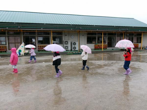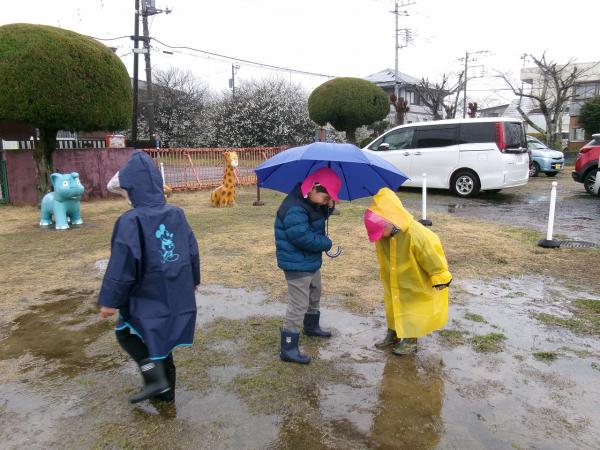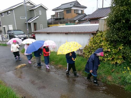「もっと雨降らないかな〜」と朝から楽しみにしていたぞう組のみんな。散歩の時間になるとたくさん降っていて期待が高まります。傘とかっぱの使い方を確認し出発!!普段みている用水路から水の音が大きく聞こえたり、傘や葉っぱなど雨が当たる場所によって音の聞こえ方が異なることを発見したりしながら散歩をしました。水たまりに入りながら歩く機会はなかなかないのでとっても楽しんでいました。「ここの水たまりは深いよ」などと喜びながら入る様子も😊