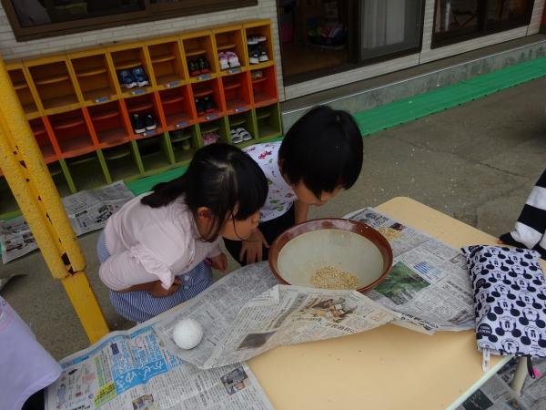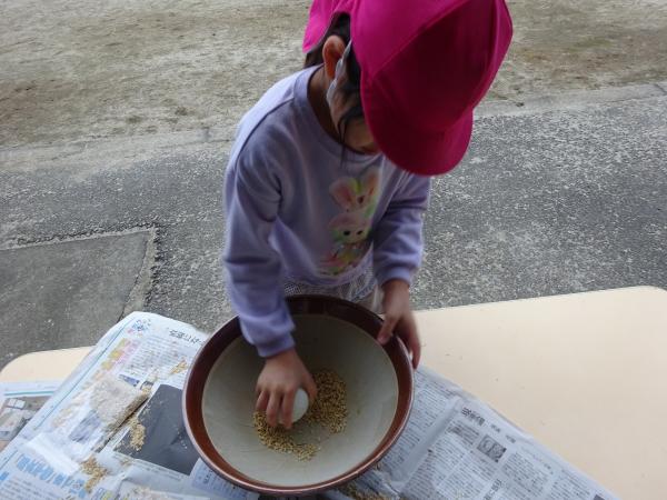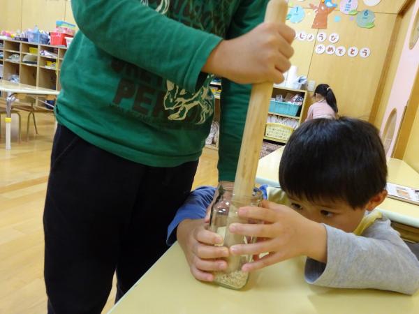 バケツ稲で収穫し、脱穀したもみを籾摺りしました。すりばちと野球ボールを使うという方法に驚きながら挑戦!すりあげたあとに、上手に細く息を吹きかけるとたくさんの籾殻が舞い上がりました。「すごーい!」と楽しみながら取り組んでいました。やっていくうちに、もみすり名人たちがたくさんいました😊もみが玄米になり、だんだんと普段みんなが見慣れた「米」に近づいてきました。その後、瓶と棒を使って精米を行いました。力加減が難しかったですが、匂いを楽しみながら頑張りました。いよいよ、今週実食予定です。お楽しみに✨