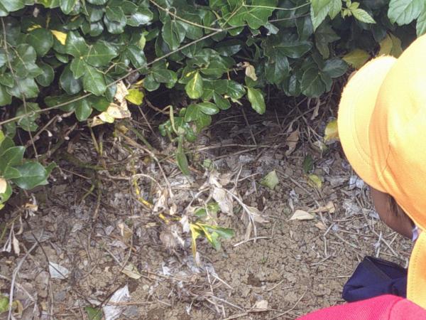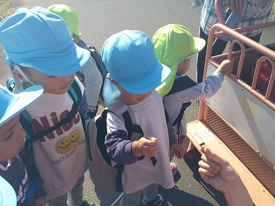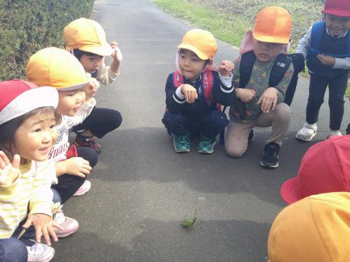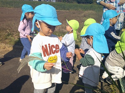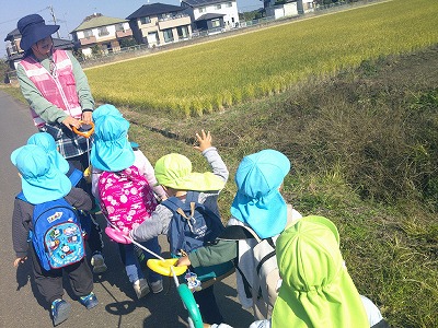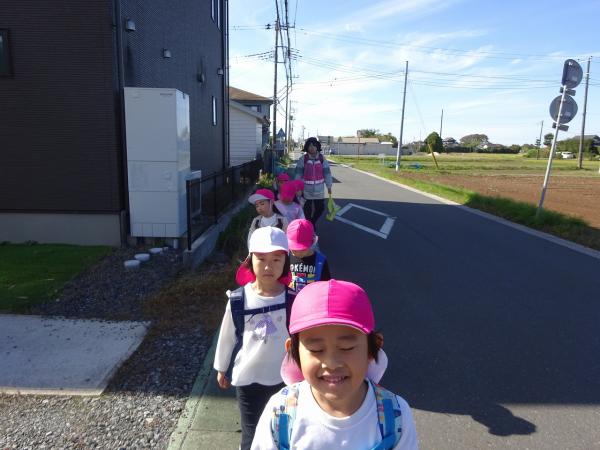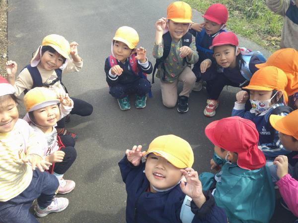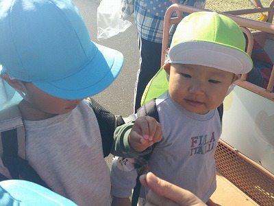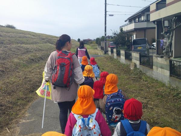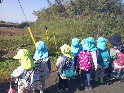 今日は誘導ロープを持って、保育所の裏までお散歩に行きました😊少しずつお散歩にも慣れてきたひよこ組さん♬誘導ロープをしっかり持って、上手に歩く姿が見られました!歩いている途中で、いろいろなものを発見👀指差しをしながら、「トンボ!」「柿あった」「トラクターいたよ」などと教えてくれました♡また、みんなでお散歩に行きましょうね✨