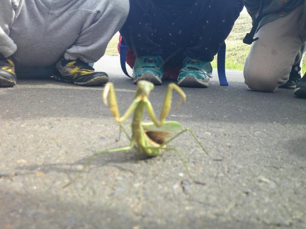 生活発表会の練習をした後、土手の方へお散歩に行きました。散策中に発見したのは、カマキリ👀!なりきり遊びの役にも登場するので、みんな嬉しくて大興奮😆周りに集まって、「手にはトゲトゲみたいなのがついてるんだね」「こんな手の形してるね」などと言いながらじっくりと観察していました🔍保育士が持ってみると・・・カマキリさんは嫌だったようでファイティングポーズ😲でも、みんなはあまり見ない姿に関心が高まったようでさらに大興奮!出発前まで行方を追っていました✨