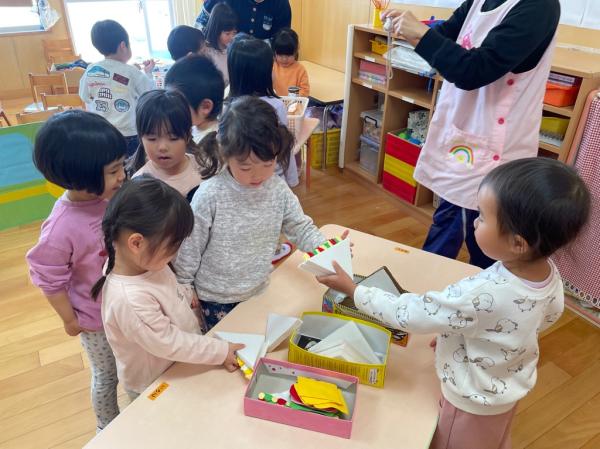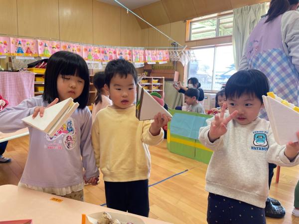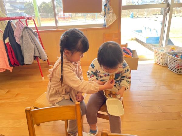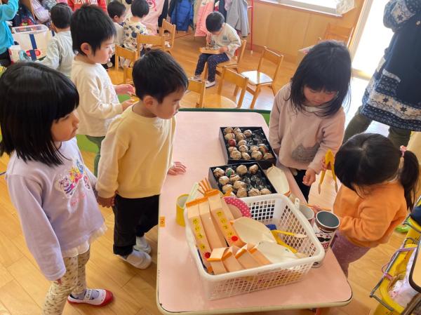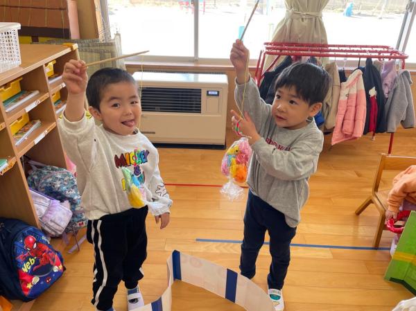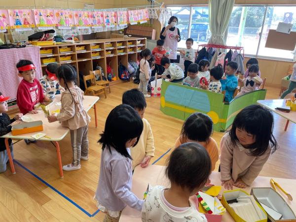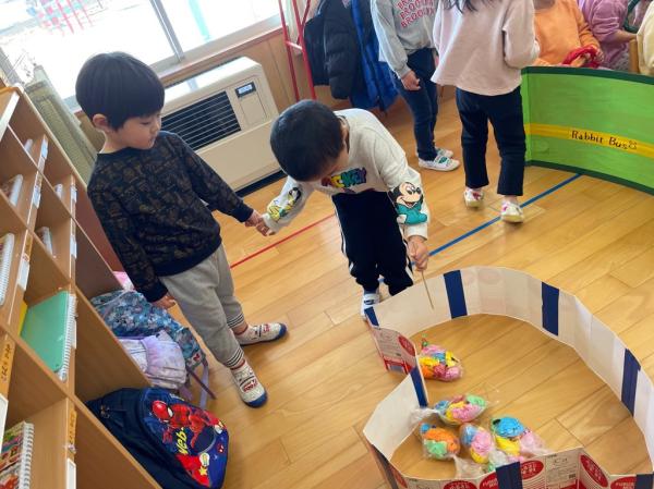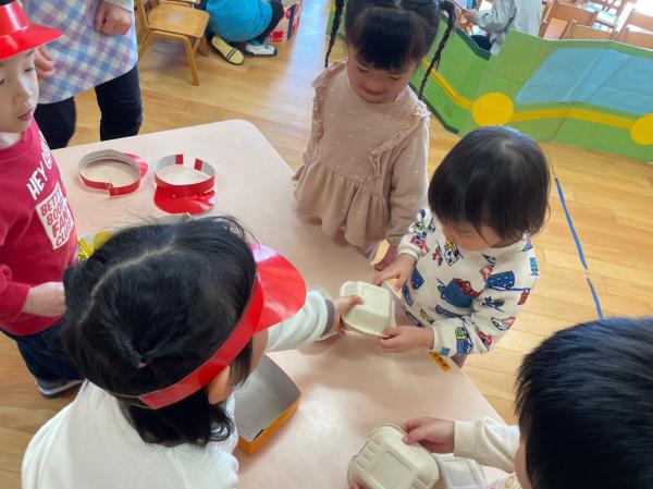 うさぎ組とりす組の2歳児で交流をしました🐰🐿今日は、うさぎ組の部屋で、ごっこ遊び✨サンドイッチやたこ焼きなどの食べ物コーナー🐙やバスごっこ🚍や魚釣り🐟など、いろいろなコーナーで遊びました🎵うさぎ組は、りす組の友達と手をつなぎ、どこのコーナーに行きたいか尋ねるなどお優しい兄さん・お姉さんの姿が見られました😊来週は戸外での交流を予定しているので、お楽しみに🌈