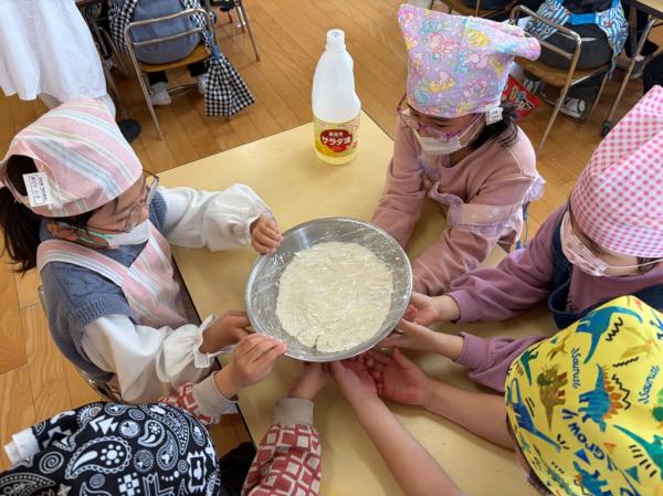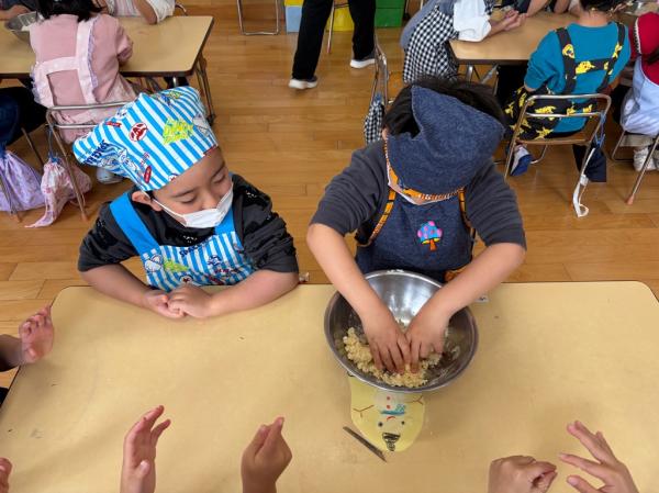 管理栄養士さんの話をよく聞き、いよいよクッキングスタート!!まずは、小麦粉の中に油を少し入れ、よく混ぜていきました。混ぜているうちに少しずつまとまり、クッキーの生地へと変化していく様子に、子ども達は「すごい!!」と目を輝かせていました。