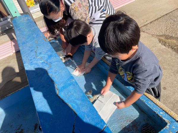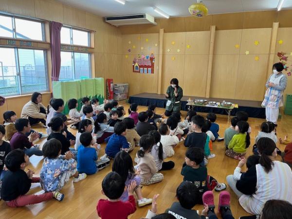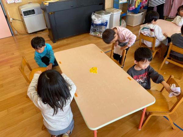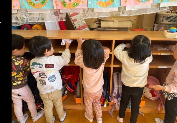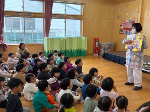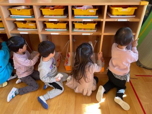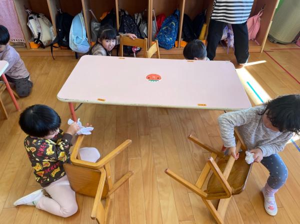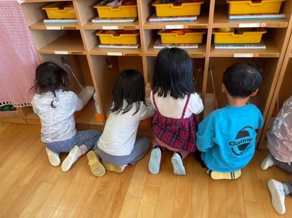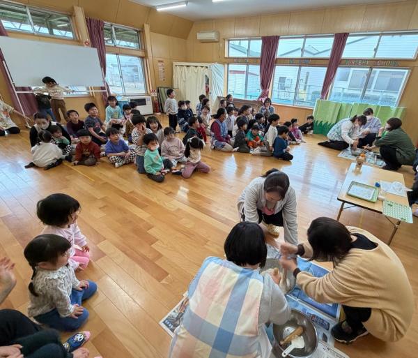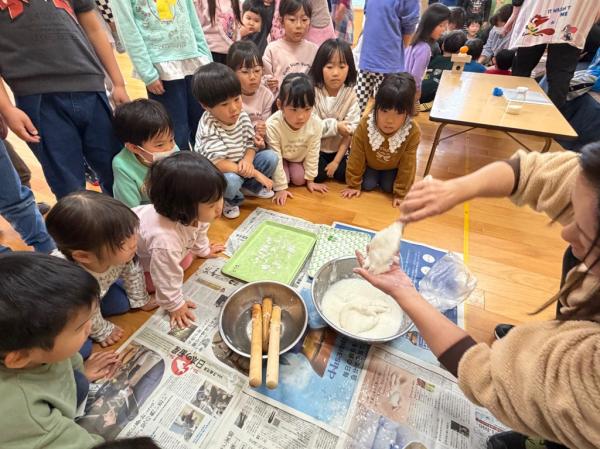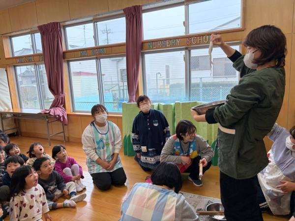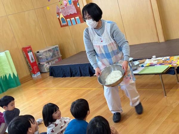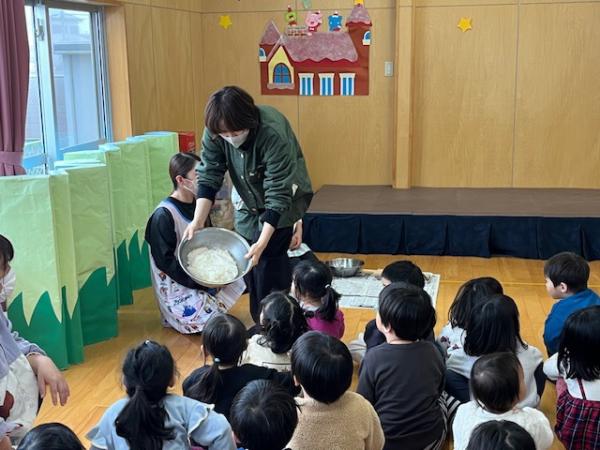 餅つきは、炊飯器と麺棒を使って行う簡易バージョン。「ばばばあちゃんのおもちつき」という絵本を参考に餅つきを行いました。事前に各クラスで絵本を読んでいたので、お餅つきのイメージはバッチリ🙆♀