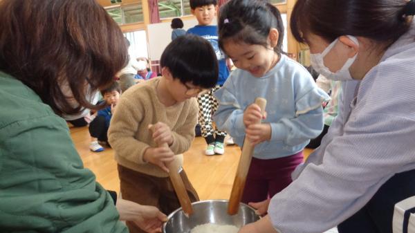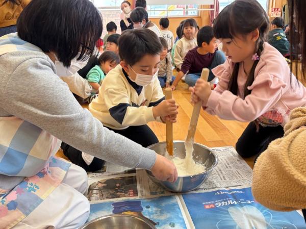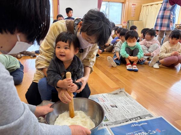 いよいよ餅つき開始!!ぱんだ組とうさぎ組チーム🐼🐰ぞう組とりす組チーム🐘🐿に分かれて、「ぺったんこ!ぺったんこ」と麺棒でお餅をつきました🖐最初は粒がたくさんあったもち米も、みんなの力で粘り強いお餅になりました😆