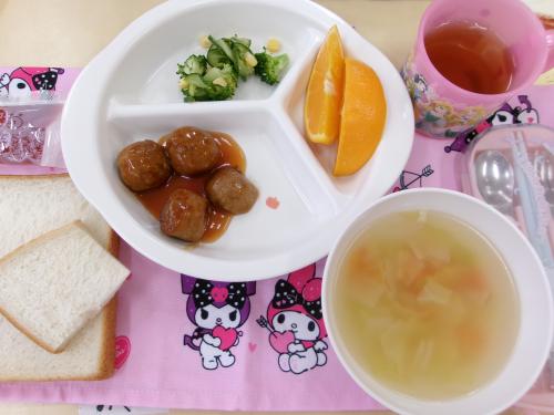 今日の給食は、 ♬ジャムサンドパン ♬ミートボール ♬ブロッコリーとコーンのサラダ ♬じゃがいものスープ ♬オレンジ 🍊 でした。 ぞう組🐘さんは、小袋に入ったいちごジャム🍓を食パン🍞につけて食べるスタイルのジャムサンドパンでした。子どもたちは、丁寧にいちごジャムの封を切り、思い思いの乗せ方でおいしそうにジャムサンドパン🍞を食べていました。