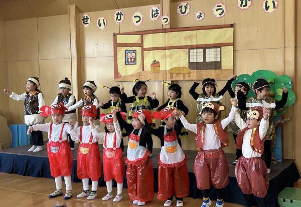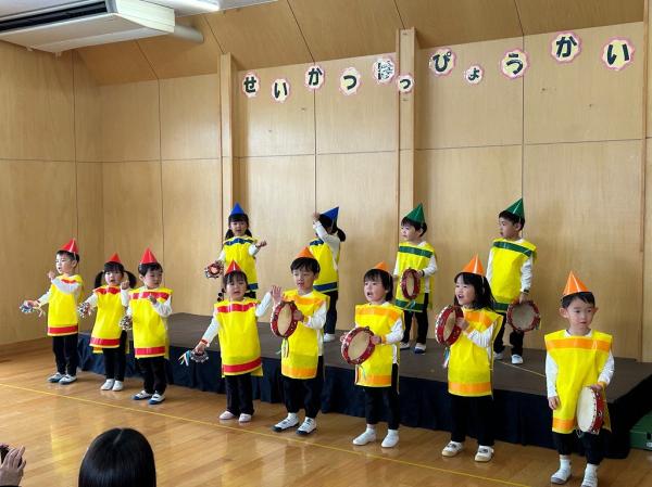 11日・12日の2日間で生活発表会を行いました🥁 子どもたちは、お家の人に見てもらうことを楽しみに、毎日練習に取り組んできました。 発表会当日、たくさんのお客さんを前にし、ドキドキしてしまう子やワクワクしている子など様々な姿が見られましたが、今まで練習してきた成果を発揮し、クラスみんなで発表することができました🕺👗 保護者の皆さま、温かい拍手をたくさんありがとうございました。また、登所時間や衣装等、そして観覧席にもご協力いただきありがとうございました。