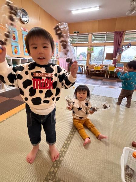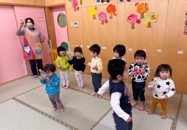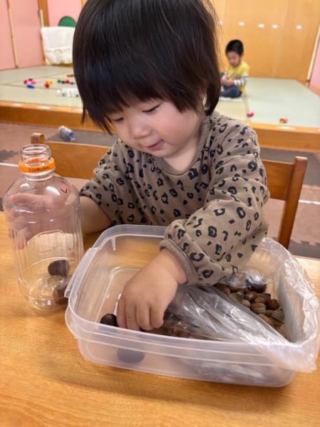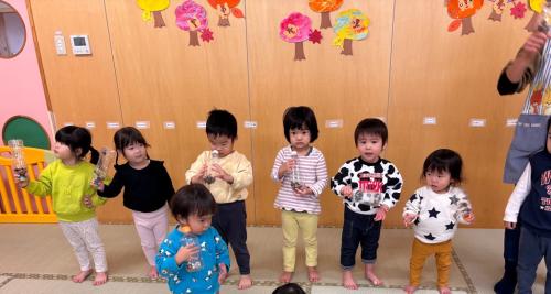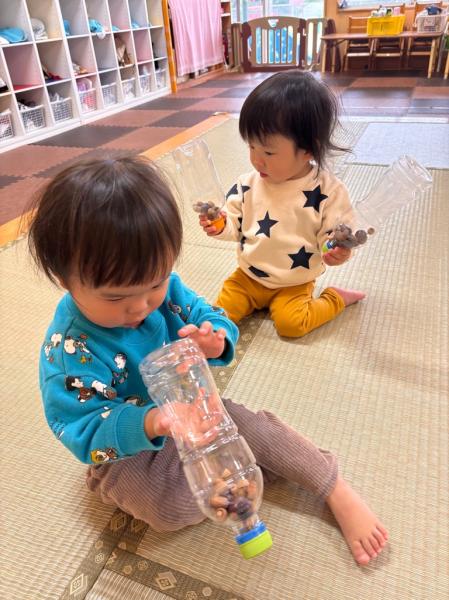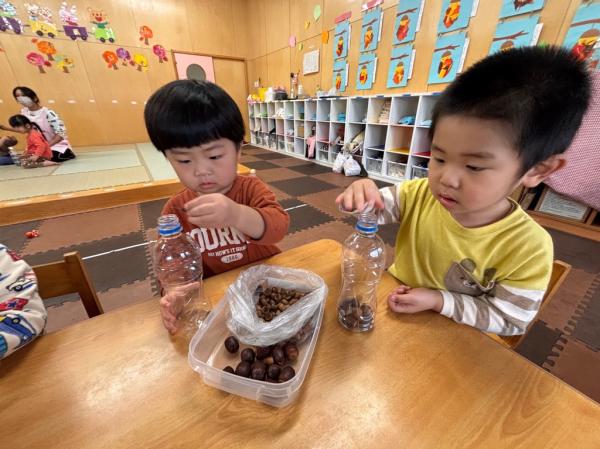 今日はみんなが作ったどんぐりのマラカスで遊びました🐿 ペットボトルに自分の好きなどんぐりを入れて、マラカスを作りました🖐『おもちゃのチャチャチャ』の曲に合わせてどんぐりマラカスをフリフリ(^O^)/シャカシャカ音がするね👂♫✨ステキな音色のどんぐりマラカス!また色々な曲に合わせて、みんなでマラカスを振って楽しみたいと思います😊💕