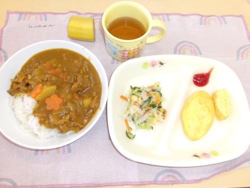 今日の給食は、 ・カレーライス ・ミニオムレツ ・コールスローサラダ ・バナナ 🍌でした。 カレーライス🍛には、型抜きしたにんじんがトッピングされていて、子どもたちは「にんじんきれい~」「星🌟の形だぁ、お花🌼の形もある」などの声が聞こえ、喜んで食べていました。今日はにんじんのオレンジ色やオムレツの黄色など、いろどりのよい献立でした。