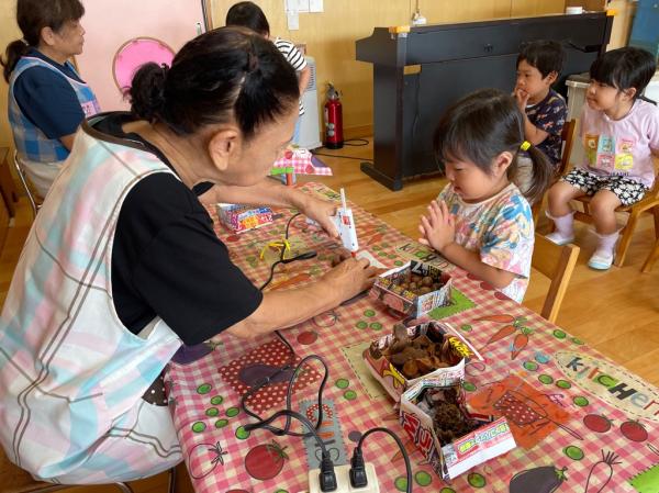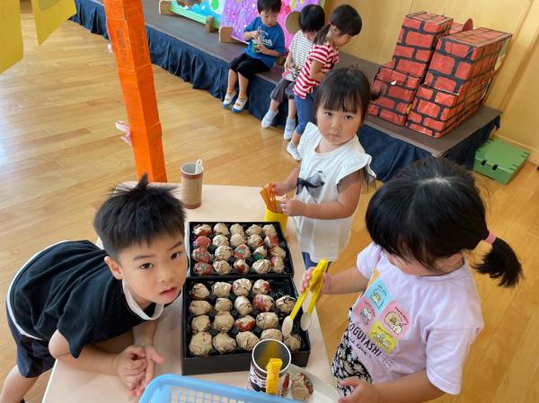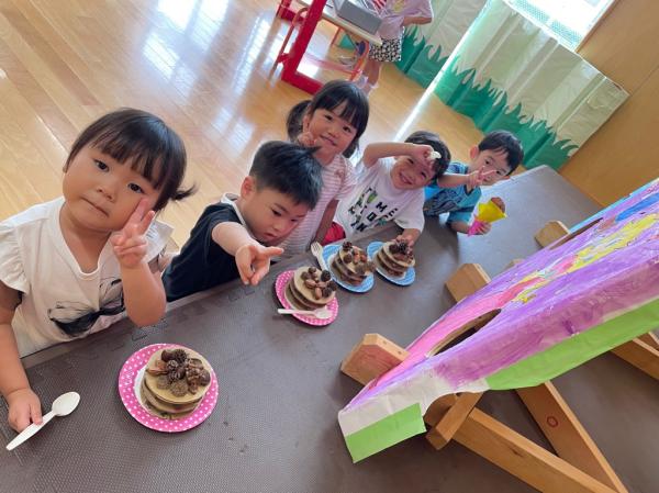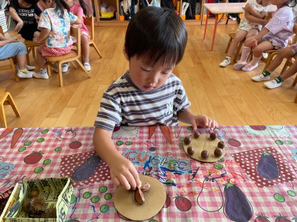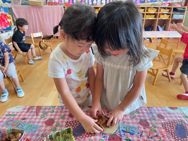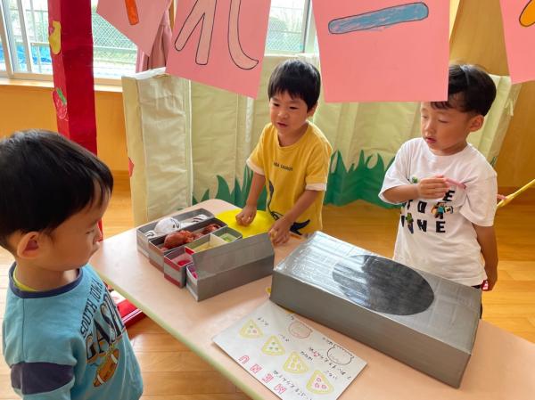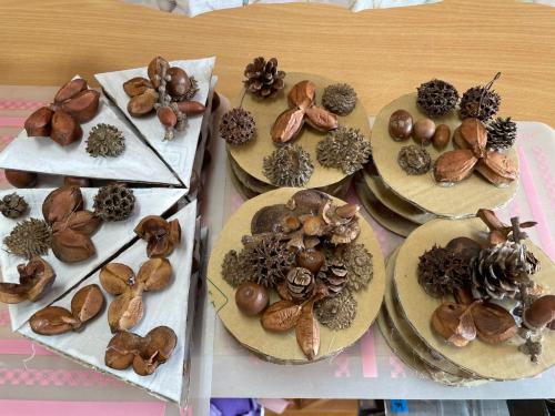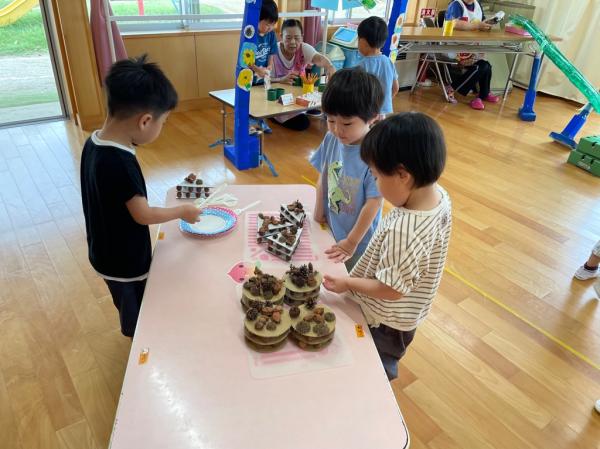 いなにっこまつりで3つのお店を開いたうさぎ組さん🐰ごっこ遊びが大好きで更に盛り上がるように新店舗の開店を計画✨秋の自然物を使ったケーキ屋さん🍰を開くことにしました☆友達と相談しながら飾るもの、飾る場所を決めて、おいしそうなケーキが完成しました😊♬ 今日は、出来上がったケーキ屋さんを加えてみんなでお店やさんごっこ👛好きな役になって思い切り楽しみました✌♥ 振り返りを行うと、足りないものに気づいたので、来週製作をして、もっともっと盛り上げたいと思います!!