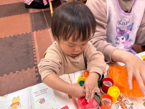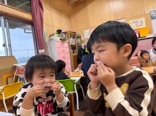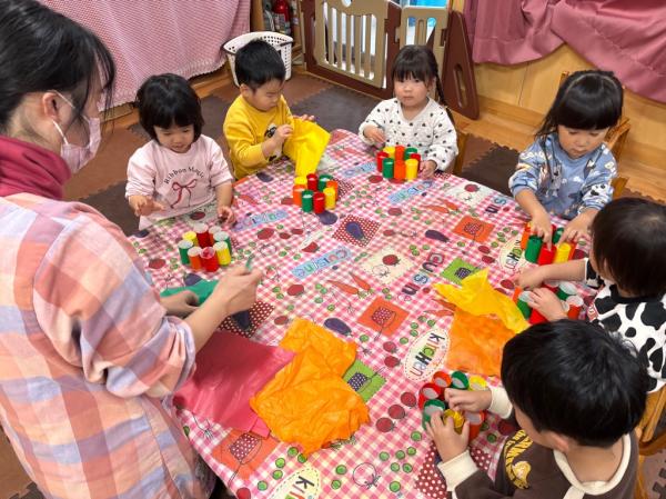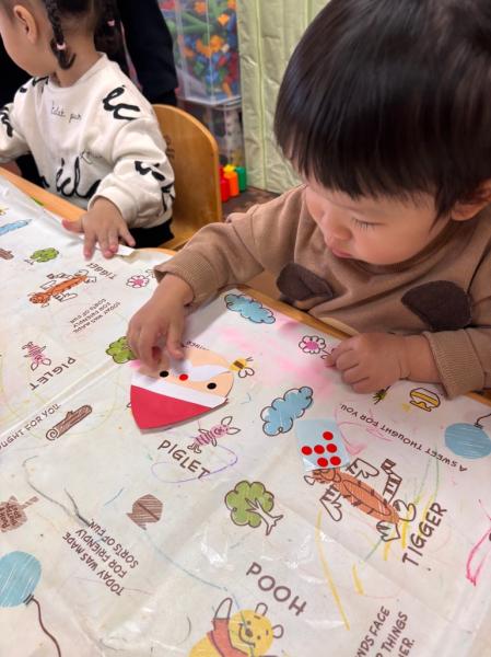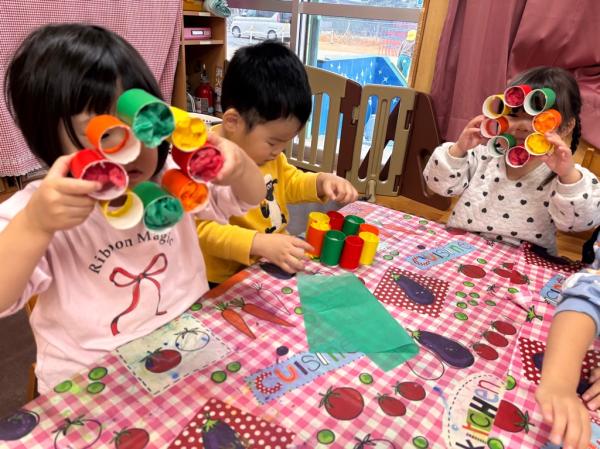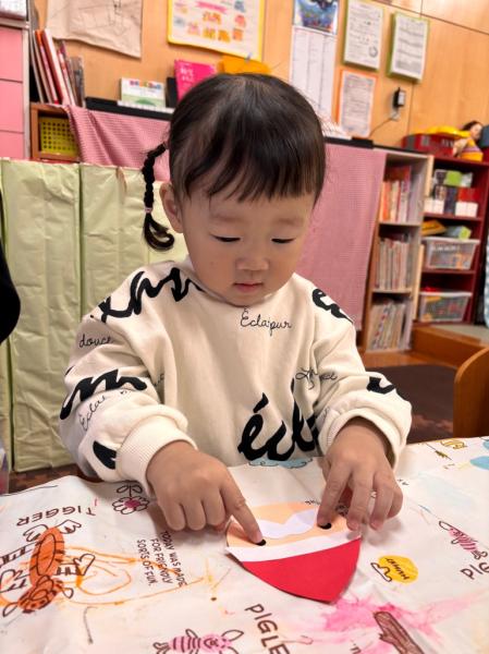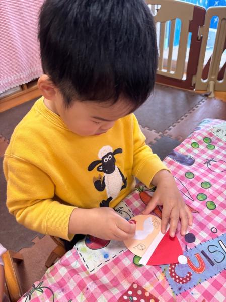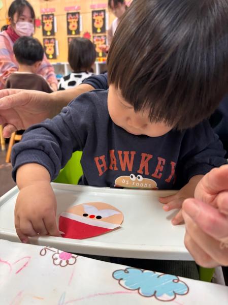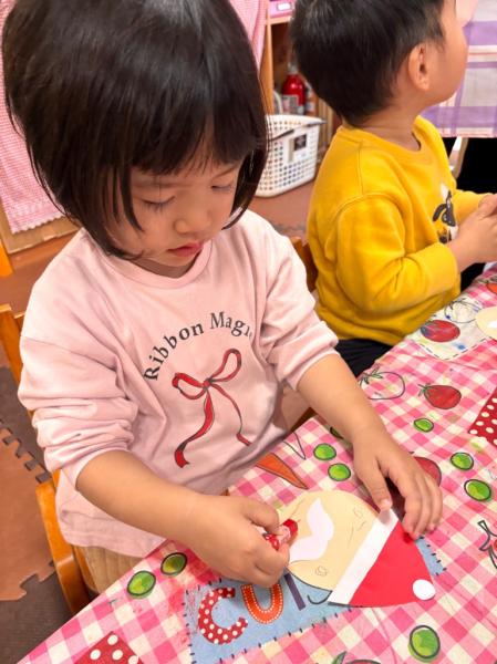 今日はクリスマス飾りのリースを作りました🎄お花紙を丸めて筒の中に入れ、サンタの顔を作ってはりました🎅 みんなお花紙と同じ色の筒に紙をくしゃくしゃ丸めて上手に入れていました。サンタクロースの顔のパーツを貼って、2歳児さんは目と口をクレヨンで描きました。「口は赤にしようかな。」「ひげはここかな?」とよく考えながら取り組んでいましたよ⭐とってもかわいいリースができました。クリスマス待ち遠しいですね💕