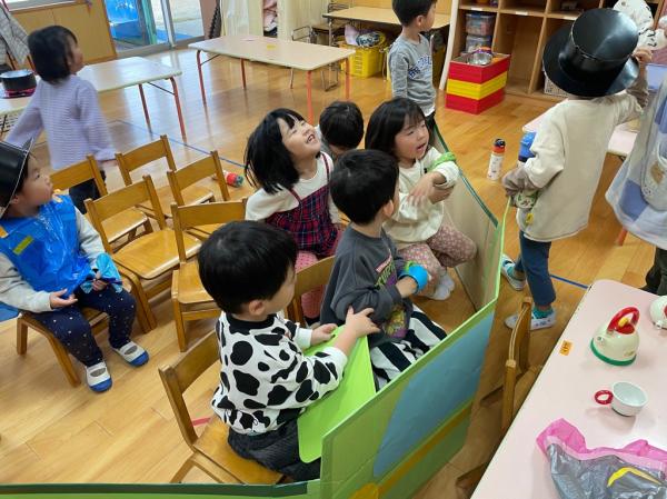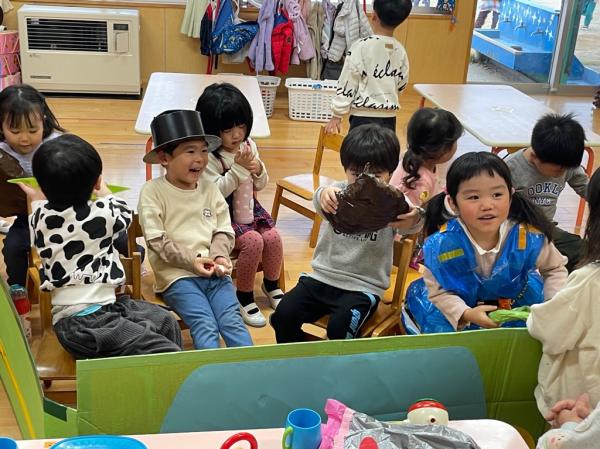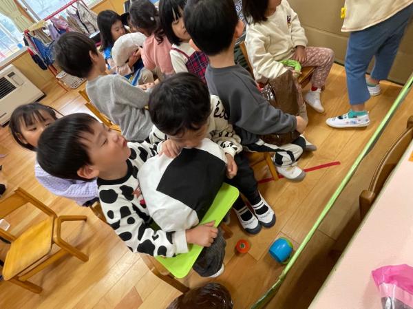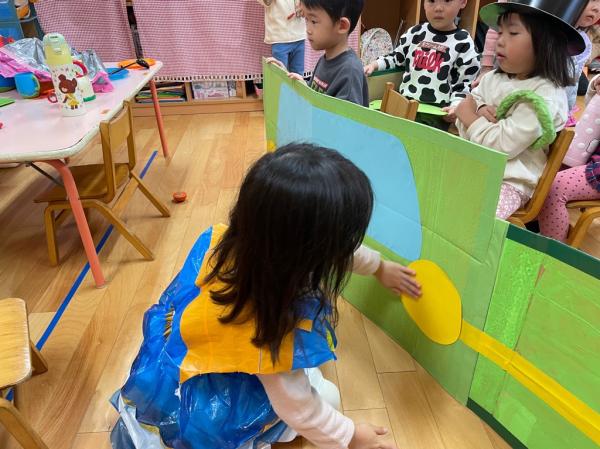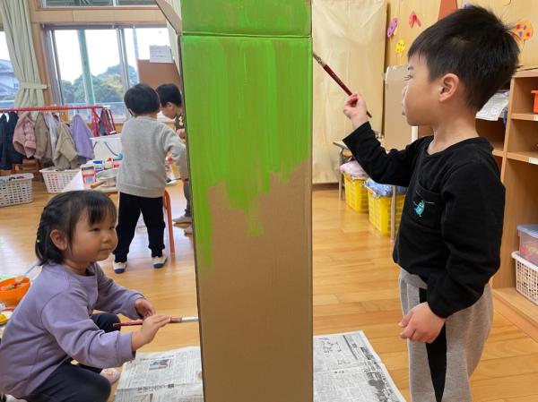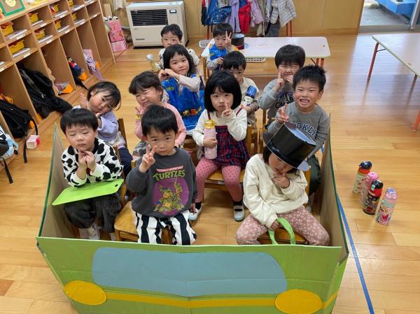 先日バスに乗って公園に遊びに行った経験から、自由遊びでバスごっこが始まりました🚌ダンボールの色塗りやガムテープ貼りなどの制作も行い、今日から乗車開始✨運転士、バスガイド、お客さんに分かれて楽しみました♬自然物で作った動物園に出かけたり、車内でおにぎりを食べたりと楽しく遊びました😊 遊びを進める中で「魚釣りいきたい🐟」など新しいアイディアも出てきているので、どんどん発展させていきたいと思います🌈