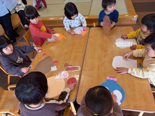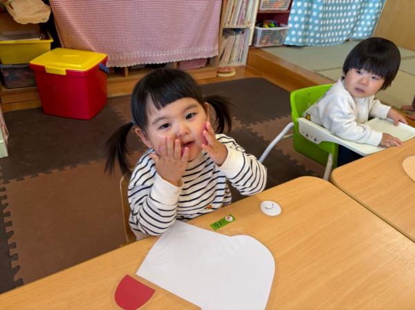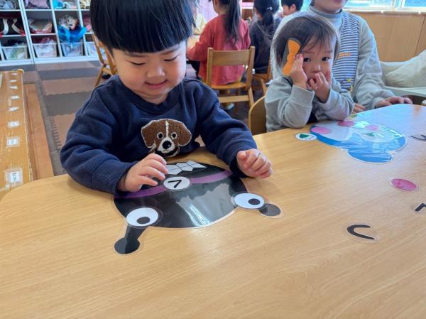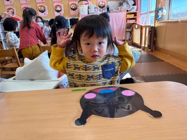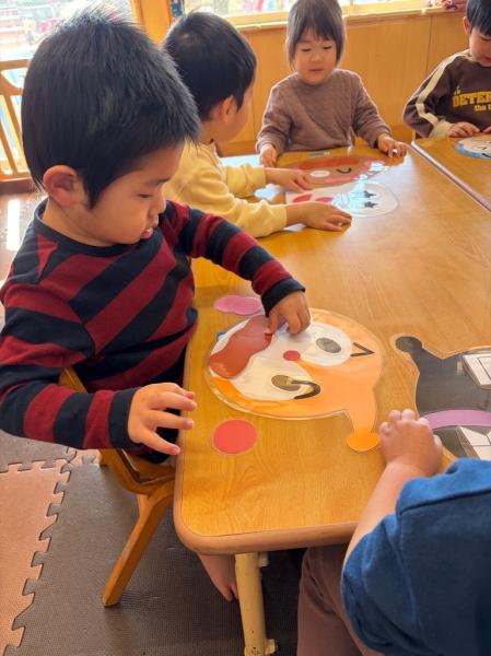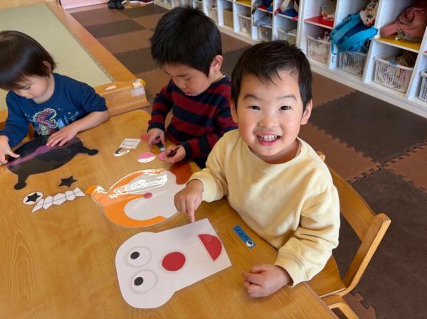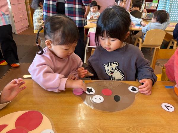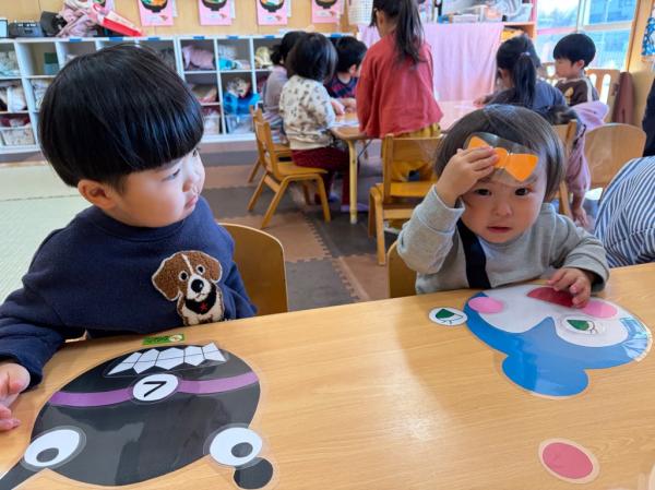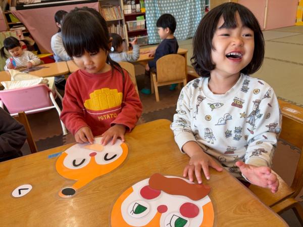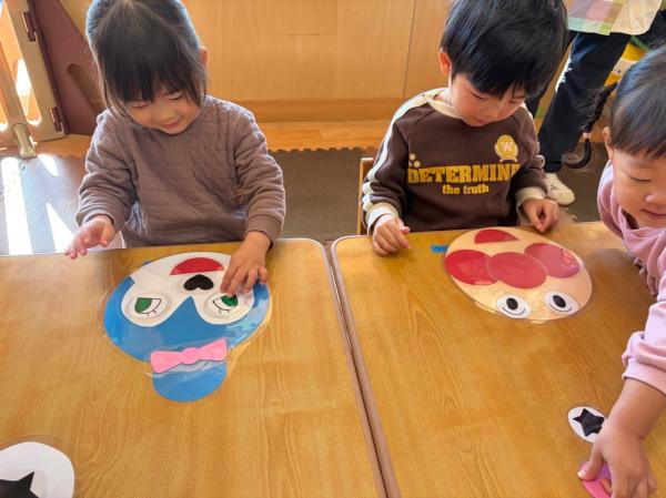 今日は福笑いで遊びました😊みんなの大好きなアンパンマンのキャラクターの福笑いです💕みんな、夢中で色々な顔のパーツを好きなように並べて様々な表情を作っていました!面白い表情ができるとみんな大笑い😁ニコニコしながら遊んでいました♫そんなみんなの笑顔が福を呼びそうでほっこりしました😆💫