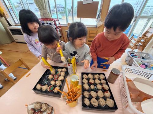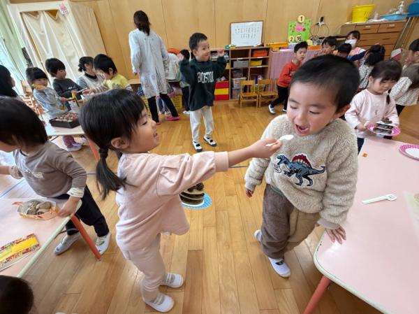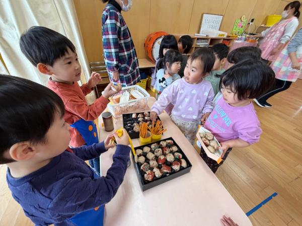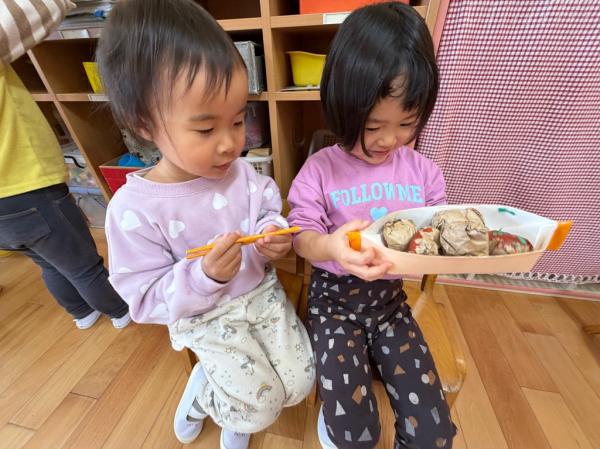 今日もうさぎ組の部屋にりす組のお友達(水色帽子さんたち)が遊びに行きました!手をつないで開店したお店でケーキやたこ焼きを買って一緒に食べたり、太鼓をたたいて演奏したりするなど仲良く遊ぶ姿が見られました😁😁💕