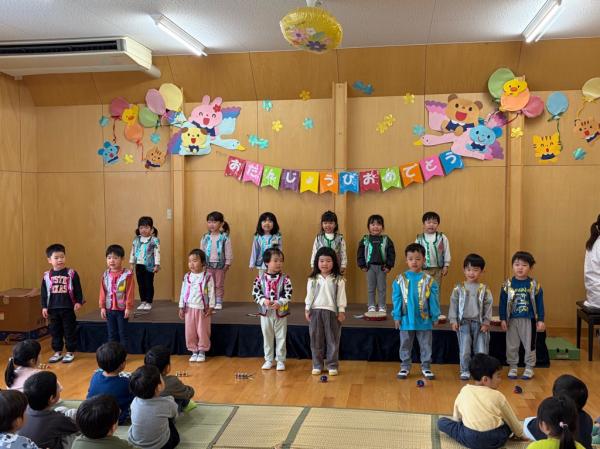 今日の出し物は・・・うさぎ組さんが楽器遊び「小さな世界」の演奏をしてくれました。カスタネット、タンバリン、鈴、トライアングルを使って、ピアノに合わせた素敵な演奏に、とっても喜んでいました😆