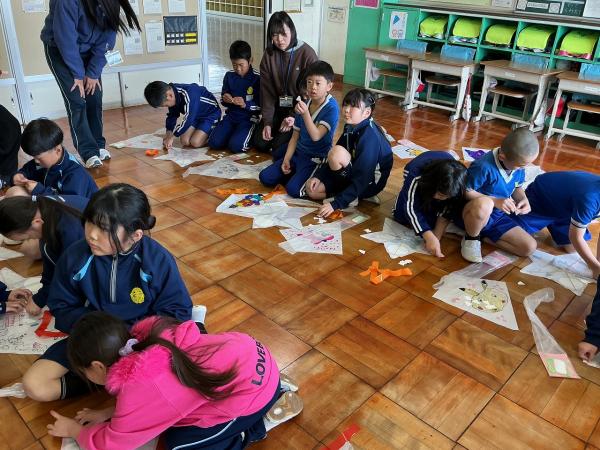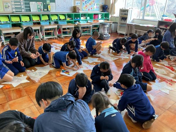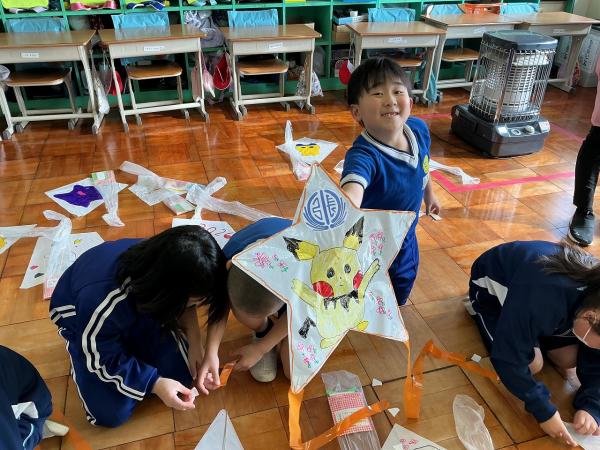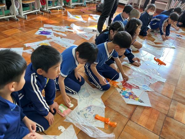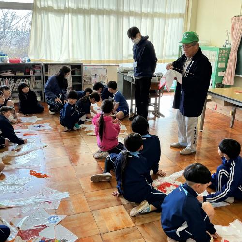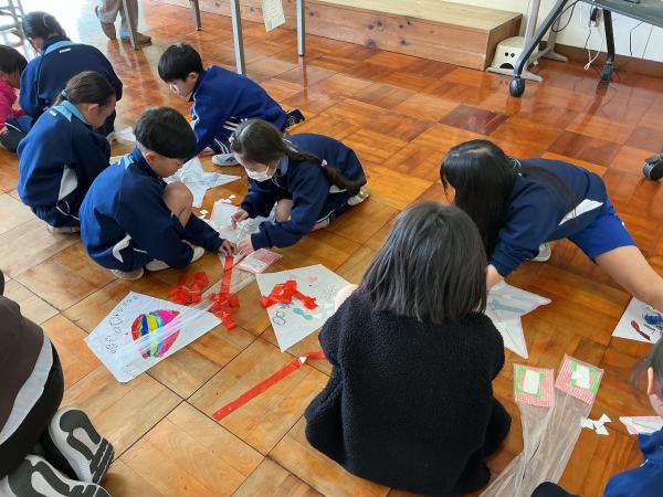 青少年育成会小張支部の木田さんに来ていただき、1~3年生で凧の骨付けを行いました。 木田さんの説明を聞いた後、3年生が1・2年生に優しくアドバイスをしながら一緒に作業をしました。上手に仕上げることができ、1・2年生も嬉しそうな表情をしていました。 できあがった凧は、2月5日(木)のたこあげ会で上げる予定です。当日は、良いお天気になるといいですね。