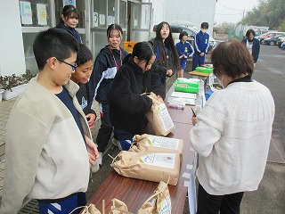 本日13時から13時45分まで、昇降口にて米・サツマイモ・白菜の販売を5・6年生が行いました。本日が最終日とあって、児童たちは気合い十分に、大きな声を出して販売をしていました。保護者の皆様だけでなく、地域の皆様もたくさん買いに来てくださり、米は完売しました。後から来校いただいた皆様、販売ができず申し訳ありませんでした。