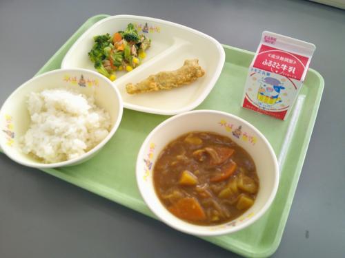 こんだて:きんめまいごはん 牛乳 こもちししゃものフリッター ブロッコリーとあかピーマンのマリネ チキンカレー ひとこと感想(6年男子) カレーの味が、ぐざいのうまみがでていてすごく美味しかったです。毎回給食をはこんで、つくってくださり、ありがとうございます。
