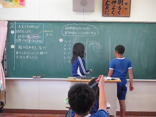 2校時、6年生は算数の学習に取り組みました。今日は、A、B、C、Dの4チームで試合をした場合、試合の組み合わせは全部で何通りあるかを考えました。 児童たちは、様々な図をノートに描きながら、何通りあるのかを探っていきました。様々な図が黒板に記載していく中で、いろいろな方法で答えが求められることに、児童たちは気付いていきました。