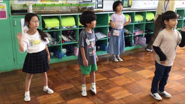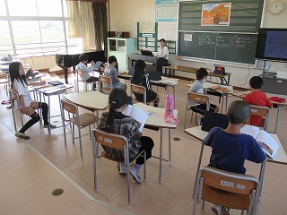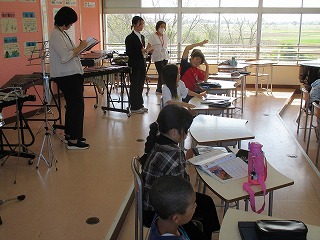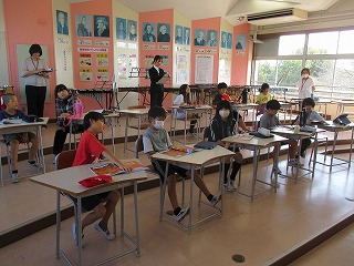 4校時、4年生は音楽室に移動し、「せんりつの重なりを感じ取ろう」の学習に取り組みました。「どうすれば『もみじ』をきれいに歌うことができるかな」というめあてを立て、学習を進めました。