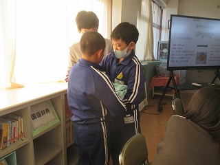 3校時は1・2年対象、4校時は5年生対象として、図書室で行いました。