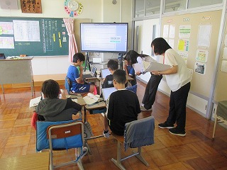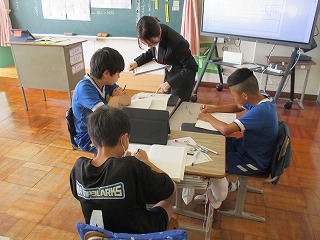3校時、5年生は国語で「『文化を受けつぐ』ことについて考えよう」の学習に取り組みました。「教材文と職人のインタビュー記事を組み合わせて読むと、どんなことが分かるだろうか」というめあてを立て、学習を進めました。