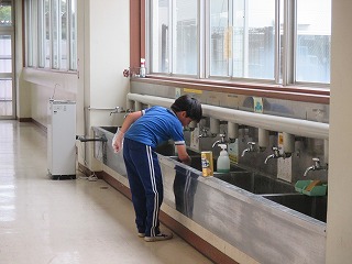 子供たちが帰った後、常総警察署のスクールサポーターの方を講師に招いて、教職員のみでの、不審者侵入対応訓練を行いました。講師の方に不審者役を演じてもらい、実際にどのように対応するか、の訓練です。普段の学校生活の中で、児童の命や安全を守るため、本気で不審者(役)に立ち向かい、緊張感ある訓練を実施することができました。終わった後は、協議を行い、今後のよりよい対応に向けて、改善点などについて話し合う等、有意義な研修となりました。