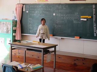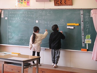 2校時、1年生は算数の時間でした。今日は、ひき算の式になる文章問題に取り組みました。今日の問題は、「みかんを8個買います。りんごはみかんより2こ少なく買います。りんごは何個買えばよいでしょう?」でした。児童たちは、ブロックを動かしたり、ノートに図をかいたりしながら、どういう式になるかを考えました。図をかいたり動かしたりしていくうちに、児童たちはひき算になることに気付き、答えを導き出していました。 1年生のみなさん、文を図に表してみると、どんな状況かすぐにわかりますね!