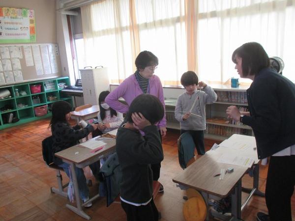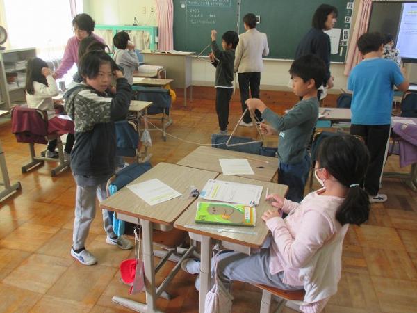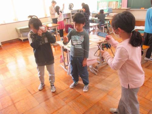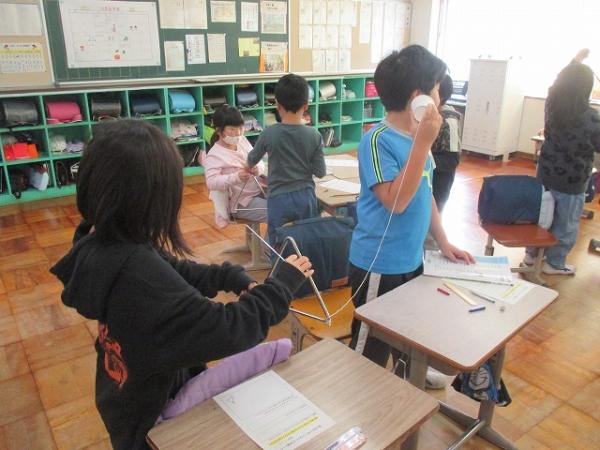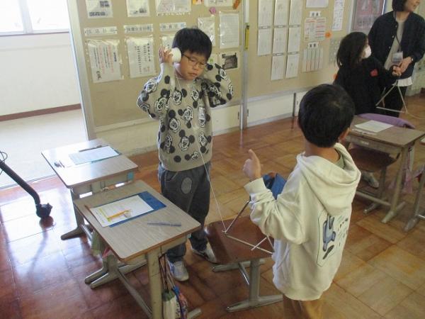 3年生の理科の学習の様子です。 音の伝わり方について、糸電話を使って実験を行っていました。 糸をつまんでみたり、ゆるめてみたりと、興味深く活動していました。