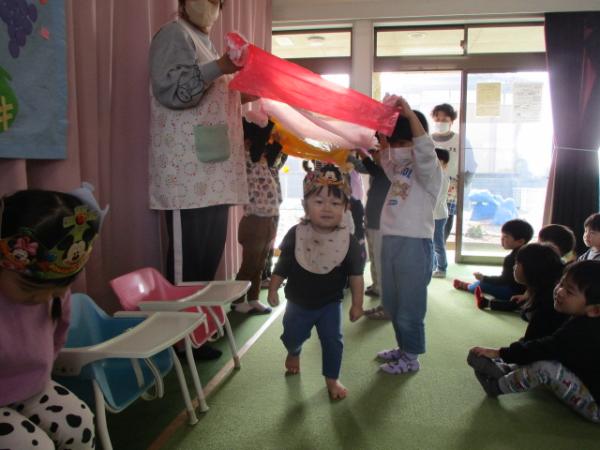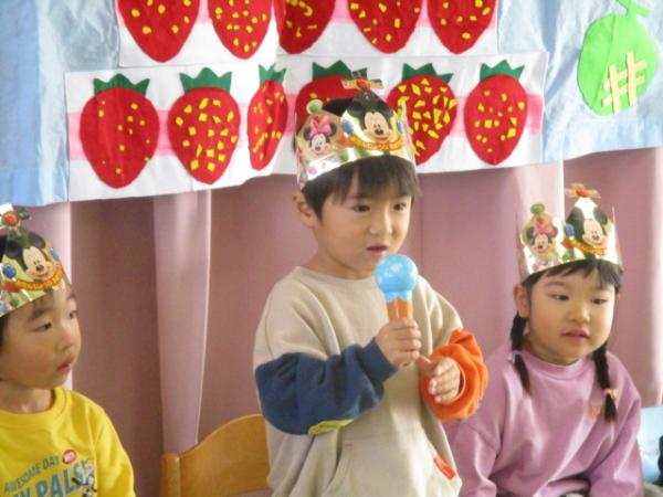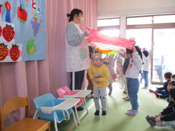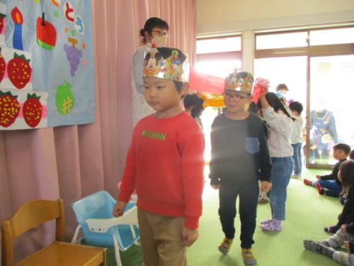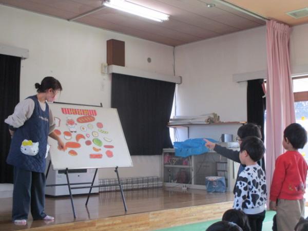 11月の誕生児の入場です😊 凛々しい表情の子、ニコニコ笑顔の子 お友達にお祝いしてもらえるのが照れくさいし 嬉しいし…HAPPYな時間を過ごしました💓 質問コーナーでは好きなものや 仲良しの友達をたくさん答えてくれました🎵 保育士からは「やおや(ぱんや)にならんだ」の パネルシアターのプレゼント🎁 最後には誕生児の選んだ具材でサンドイッチが完成(^O^) みんなでムシャムシャ食べて「ごちそうさま」をして会を閉じました😆