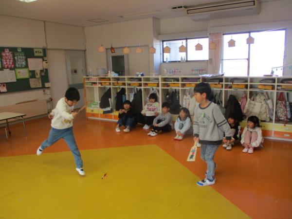 寒さに負けずに毎日元気に戸外遊びを楽しんでいる子ども達💨 短縄跳びやマラソンなど、色々なことに挑戦して、できることが増えました🎵 また給食の配膳時に、トレーに自分たちで食器を乗せて運ぶこともできるようになったよ😍 その他にも1月から特訓していた羽子板も上達して、 本日無事に第1回羽子板大会を開催することができました✨ 勝負の行方はいかに・・・🏅
