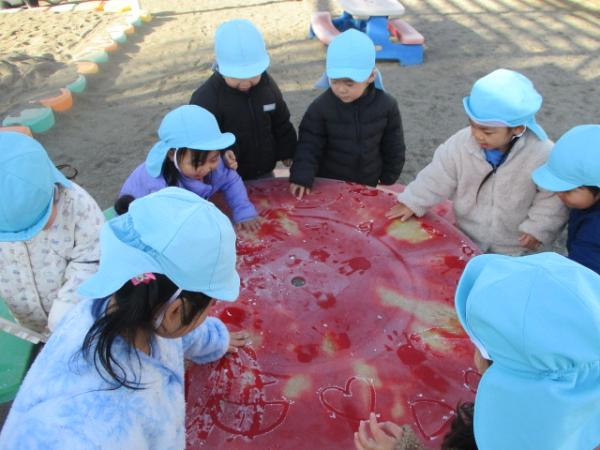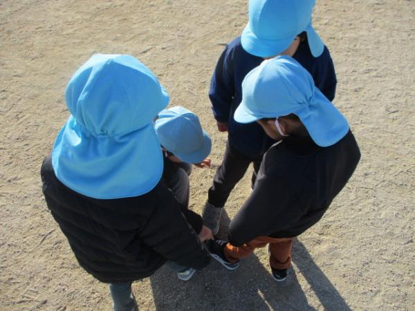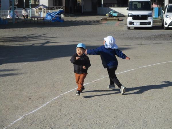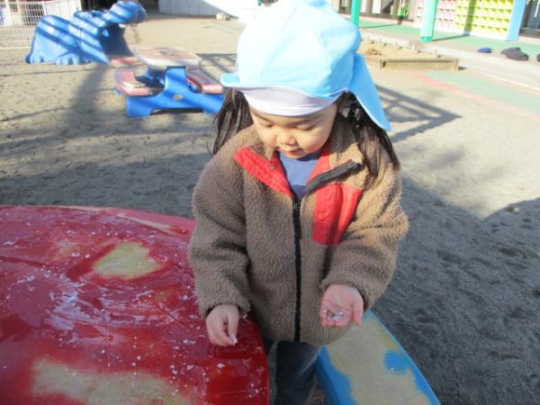 戸外遊びでは、霜に興味をもち触ってみたり、鬼ごっこを楽しんだりしています😆