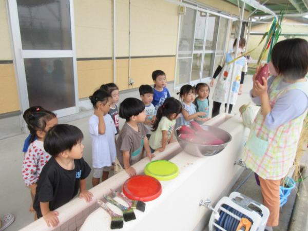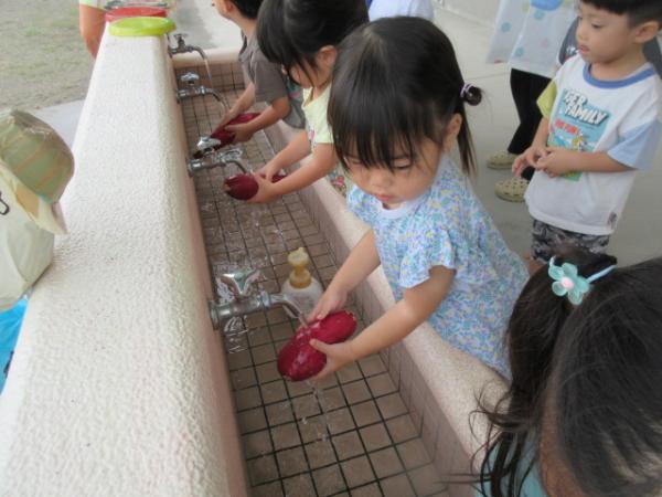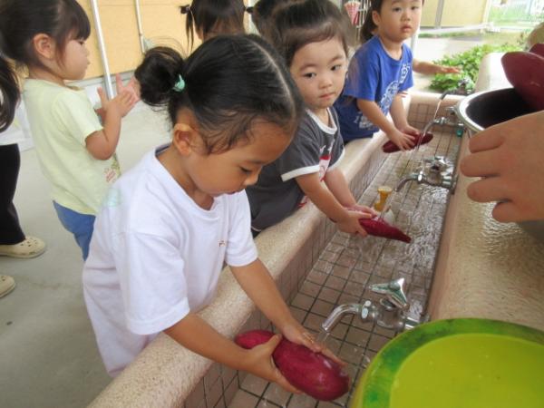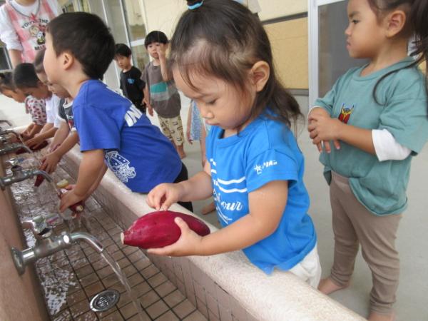 少しずつ涼しくなってきて、戸外遊びができる日が増えてきました🌞窓から外を見ては「今日はお外で遊べるかな~?😗」と天気を気にしています✨ そして、お手伝いが大好きな子どもたちは、おやつに使用するさつまいも洗いにも挑戦しました🍽️ 明日は良い天気になるといいですね😆❤️