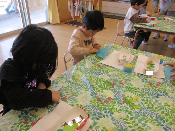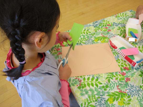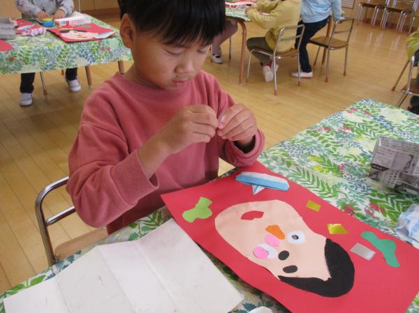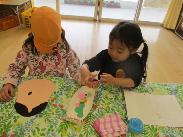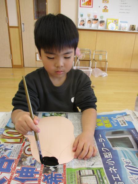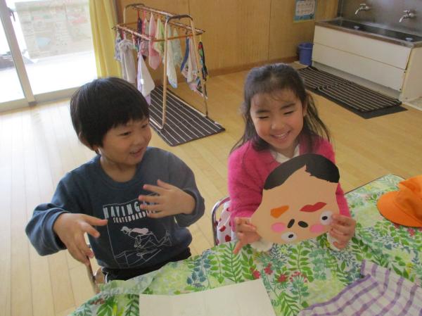 1月の制作では、福笑いをしておかめさんを作りました✨顔のパーツを切り、友達とペアになって福笑いをしてみました🎶目や口がいろいろなところに行ってしまい、友達のやっている姿に思わず笑ってしまう子も・・・🥰完成した自分の作品を見て、友達と笑い合っていました💕いろいろな顔ができ上がったので、飾るのを楽しみにしていてください😉✌