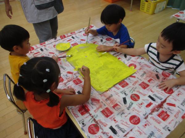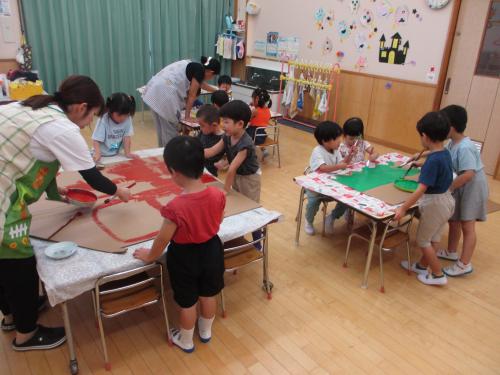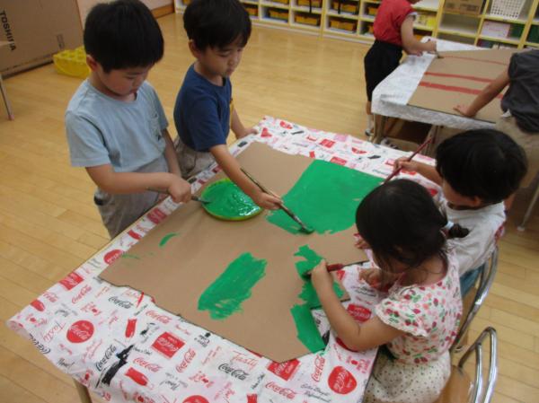 生活発表会に向けて、みんなで大道具作りをしました😊🎶緑や茶色などの絵の具でダンボールをぬりぬり🎨💦大きなダンボール塗りにみんな大喜びでした😆💕次は何を塗るのかな?👀まだまだたくさん作るものがありますので、引き続きみんなで頑張っていきたいと思います❤