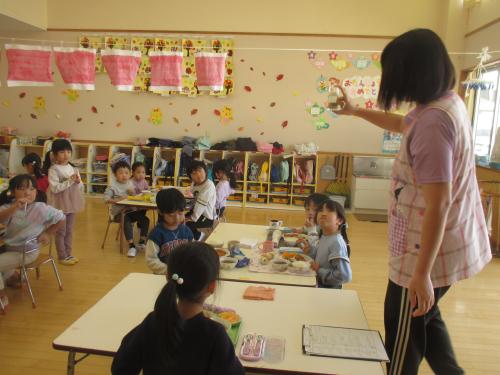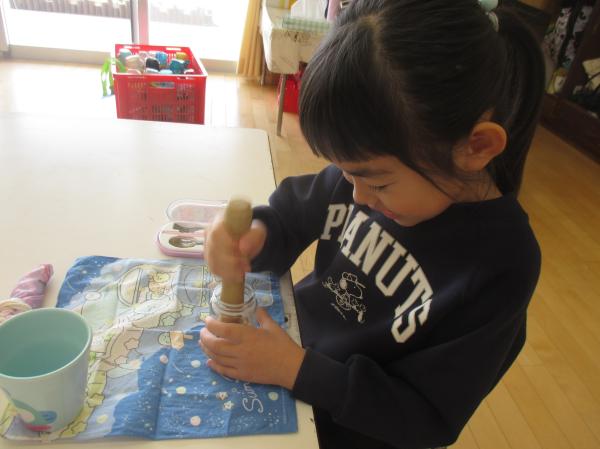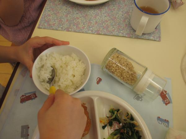 昨日脱穀、籾すりを行ったきりん組さん💖今日から精米作業を始めました。容器に玄米を入れて、棒でついていきます。今までの作業のように、目に見える分かりやすい変化がなく、精米は地味な作業です。それでも「私もやってみた~い」とみんな興味津々です😲今日の給食は、みそチキンカツ✨とってもご飯がすすむメニューでした🎶食べながら玄米と色の違いを比べて見た、きりん組さんでした😉今後は他のクラスの力も借りて、どこまで白くなるのか挑戦してみたいと思います。