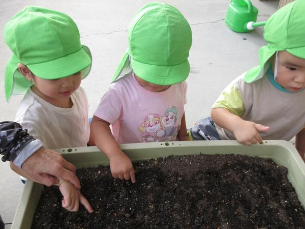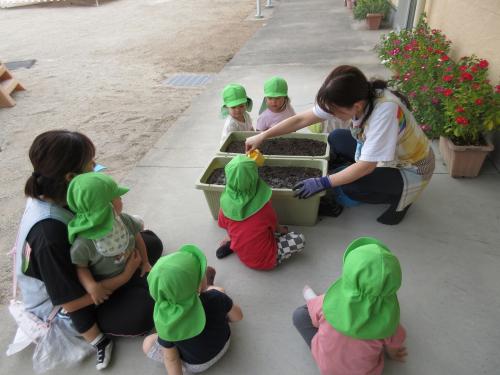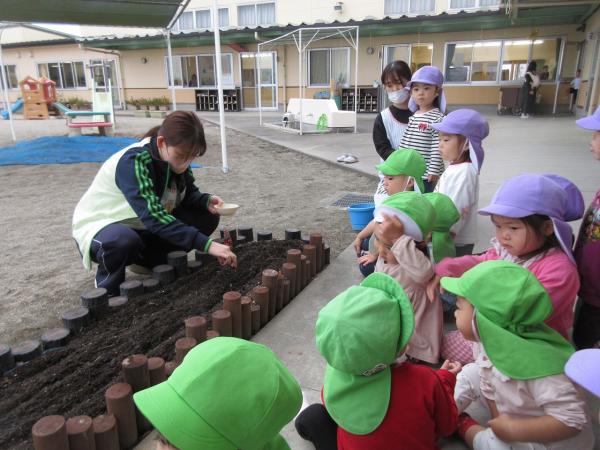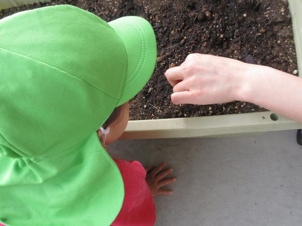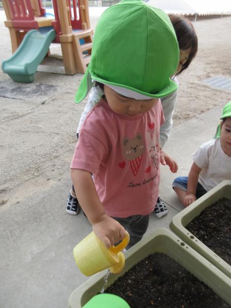 ひよこ組前テラスでカブを、きりん・ぱんだ組前の花壇でラディッシュの種まきをしました! 担任が土仕事をする様子に興味津々👀 小さな種なのでこぼさないよう担任が種まきし、子どもたちはそっと土をかけたり水やりをしたりしてお手伝いしました😊 『おおきなかぶ』の絵本が大好きなので、「あまいあまいかぶになれ、おおきなおおきなかぶになれ!」とみんなで絵本のフレーズを言って成長を願いました😌