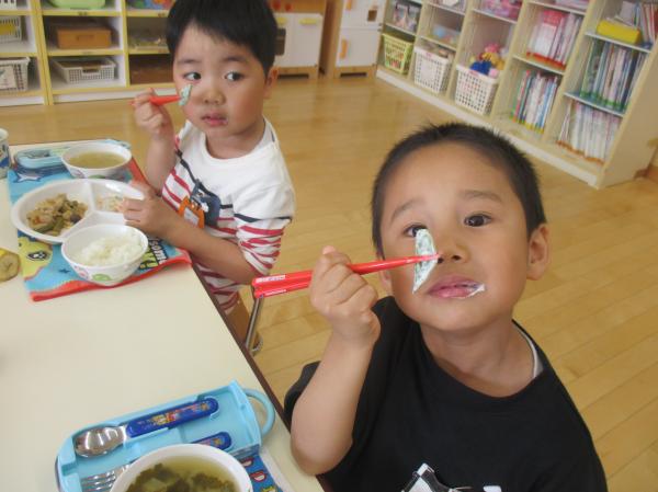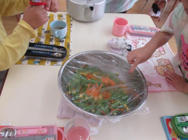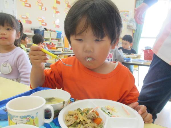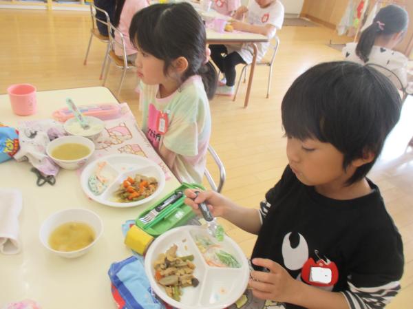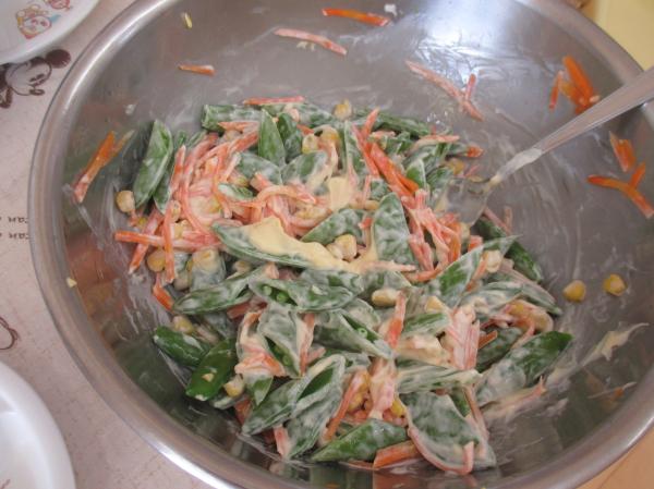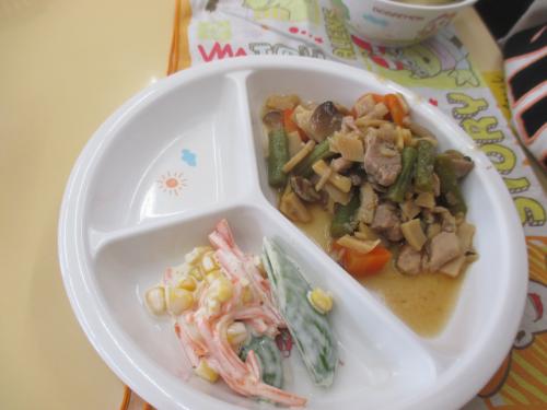 今日の給食は「マメ豆デー🎵」 2種類のお豆が使われました😁スナップエンドウと、筑前煮に入っていた「いんげん」で、どちらも今が旬のお野菜です🎵お手伝いをしてくれたきりん組さんは、特別に❗😲目の前でサラダを和えてもらい、出来立てのサラダを食べました🌈自分たちが料理にかかわったという気持ちがあると、「少しは食べてみようかな🤔」という気持ちが芽生えるようで、苦手な子も頑張って挑戦していましたよ🎉ぜひ家庭でもお手伝いをしてみてくださいね🍳