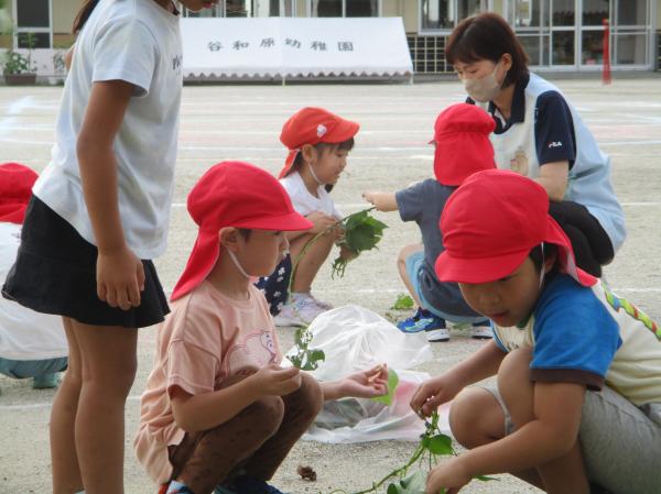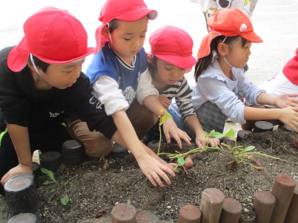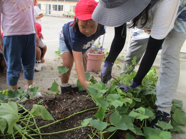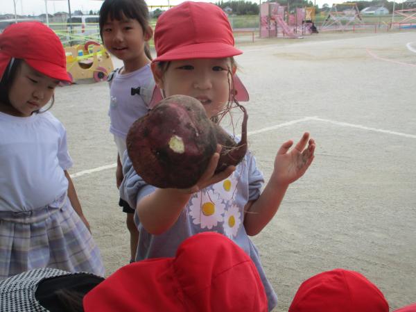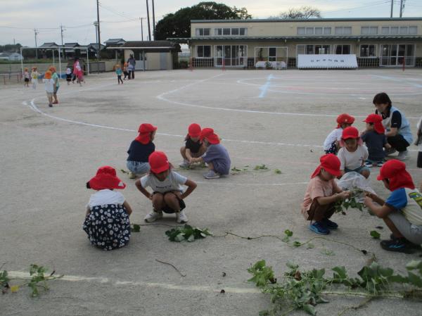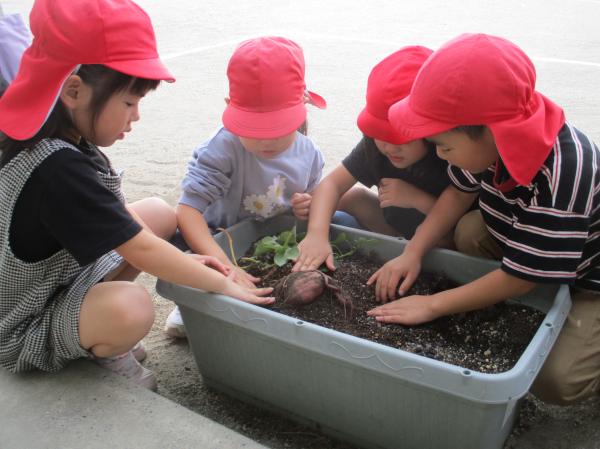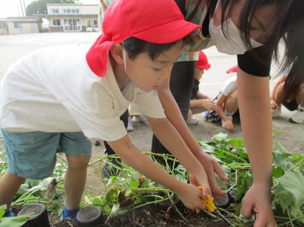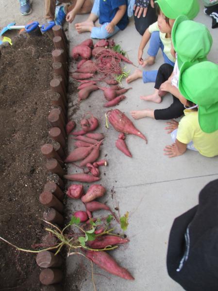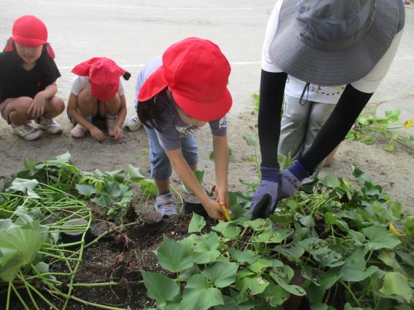 きりん組が、5月半ば頃から育てていたさつまいも🍠そろそろ収穫の時期を迎えました✨子どもたちは、芋掘りに向けて色んな絵本を読んでいたので興味津々👀「芋掘りの前に、まずはツルをハサミで切ろう!」ということで、一人ひとりハサミでチョッキン✄!!切ったツルは丸めてリースに大変身✨今後、子どもたちと飾り付けをしていきたいと思います😊また、今日はさつまいもを掘りました🍠色んな大きさのさつまいもが収穫できて大喜びな子どもたちでした💓