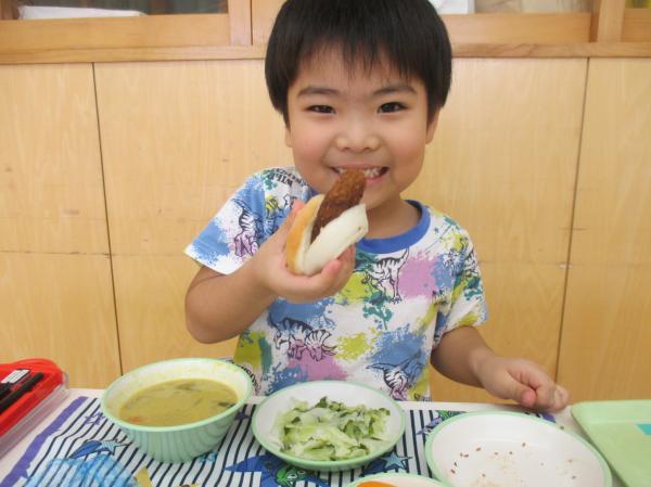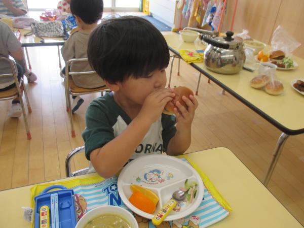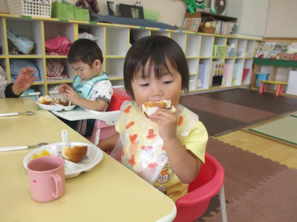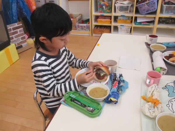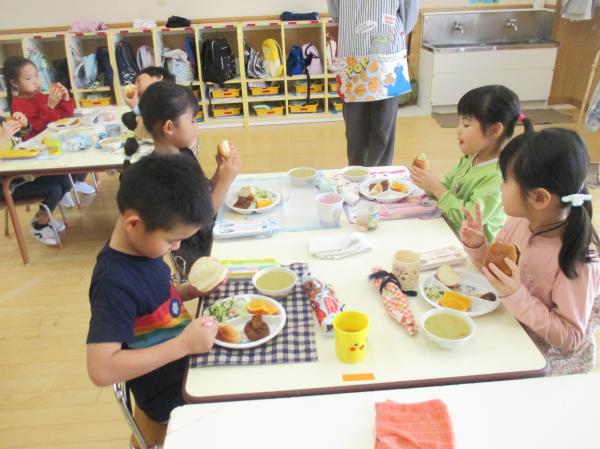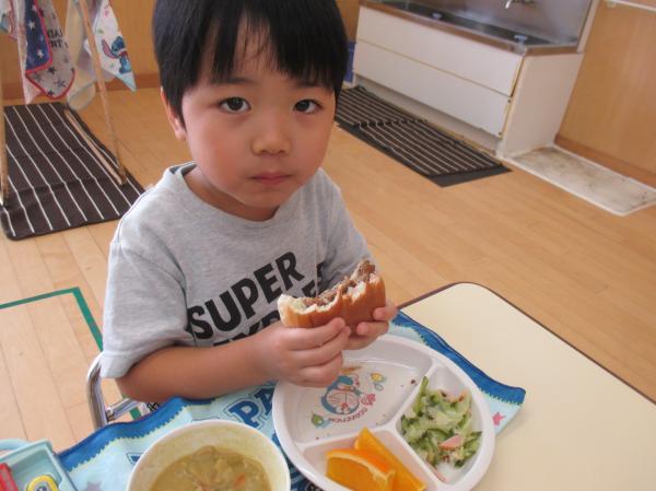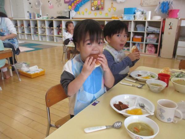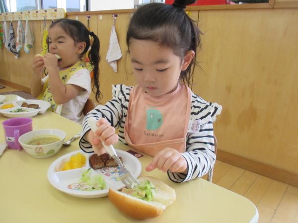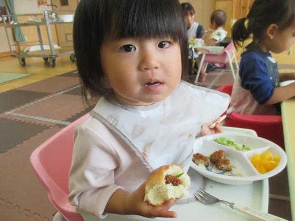 今日のメニューはロールパン、メンチカツ、コールスローサラダ、根菜のカレー風味スープ、オレンジ🍊でした。ロールパンではさむと、「ハンバーガーみたい」と喜んでくれました❤ちょっと肌寒いので、根菜のカレー風味スープもとても美味しかったです👌口の中に食べ物を取り込む動作は、噛む力を育てることにつながります。落とさないように手で持ち、目で見て、大きく口をあけて、こぼさないようにかじりとる・・・と、食べる時には色々な動作が同時に行われています。次は何をはさんで食べようか、楽しみですね♬