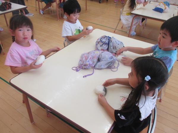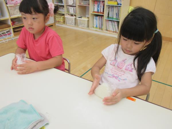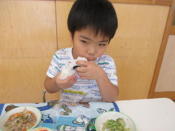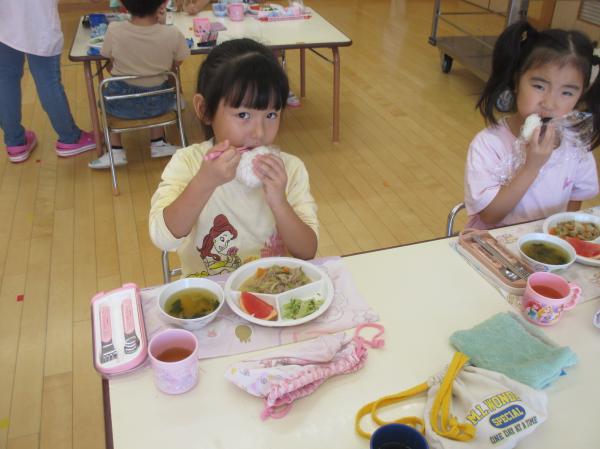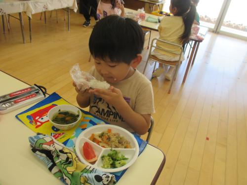 最近のぱんだ組では、おむすびが大流行✨それも、大きくてさんかくで、真ん中に海苔が巻いてる、あのおむすび🍙なんです。今日は英語のレッスンが終って教室に戻ってみると、炊飯器からお米の炊けるいい匂いが💕管理栄養士の先生が用意してくれて、みんなでさんかくおむすびを握って食べることに😉炊けるまでの間、管理栄養士の先生におむすびについて色々教えてもらいました🍙色々な形があったり、ご当地おむすびがあったり、奥がふか~い❣🤔今日はラップを使った特別な方法を教えてもらい、おむすびが完成🎶出来たてのご飯で作ったので、格別の美味しさでした🥰みんな、勢いよくかぶりついて食べていましたよ✨