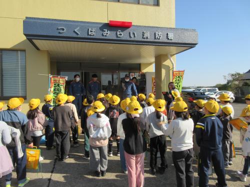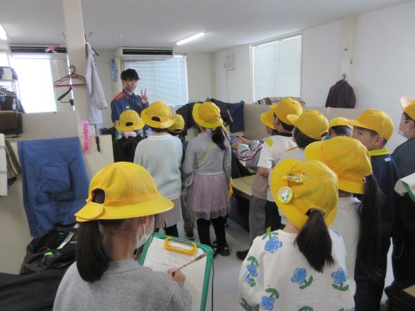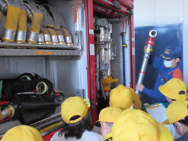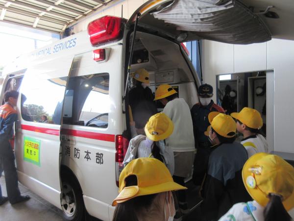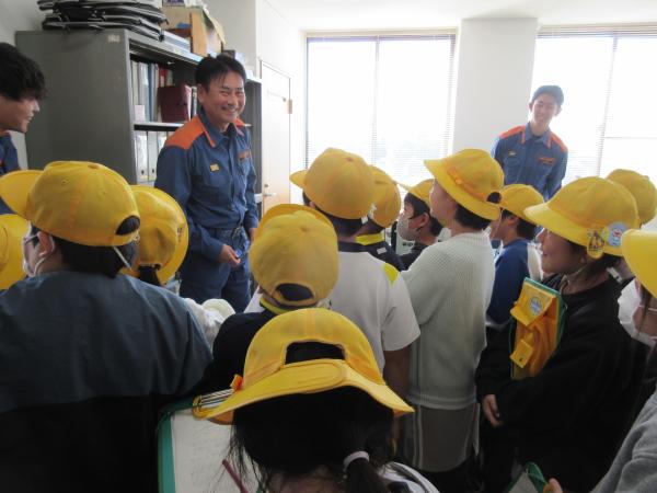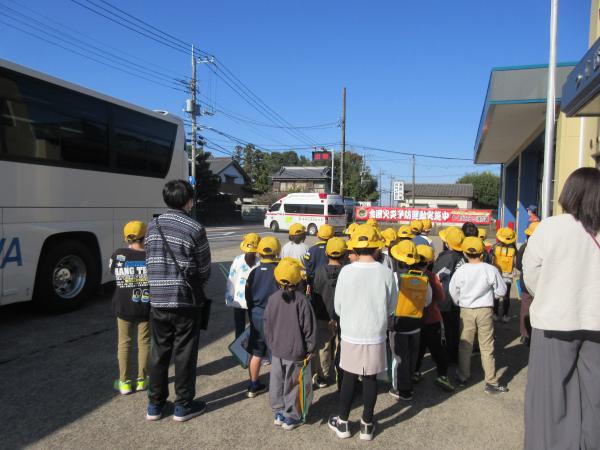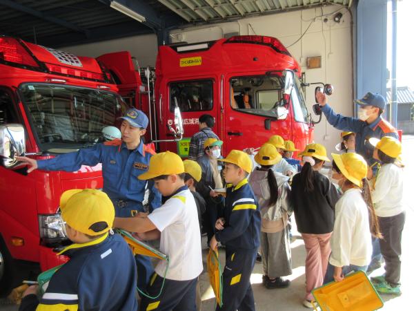 3年生が社会科の学習で消防署を見学しました。タンク車やポンプ車を見せていただいたほか、出動した救急車が戻った際には車内も見学できました。署内では、シャワー室や仮眠室、食堂、出動準備室などを案内していただき、消防署での仕事や生活について理解を深めることができました。