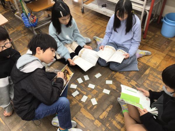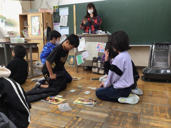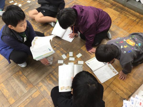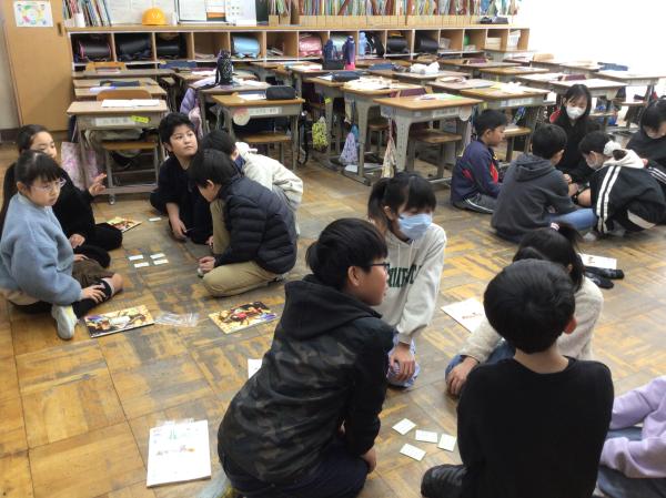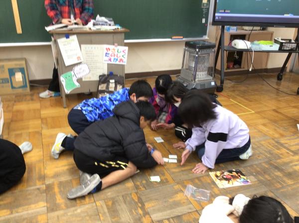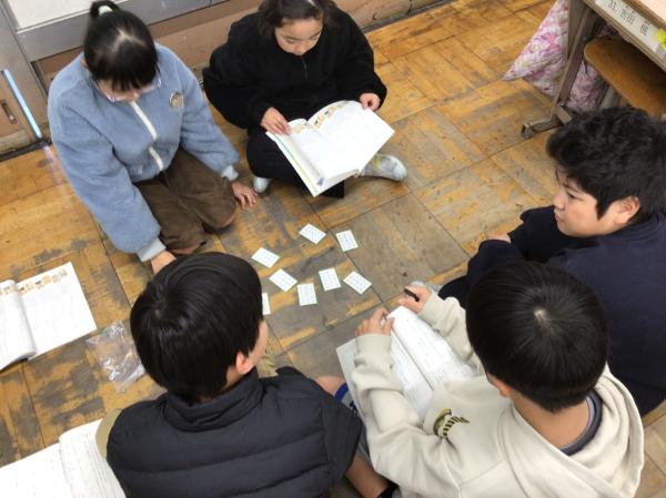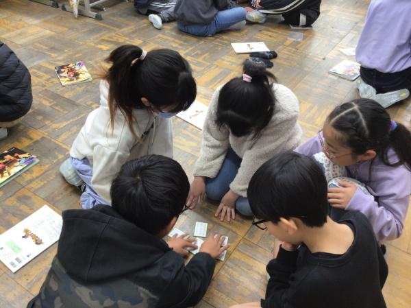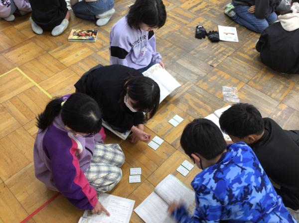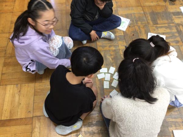 百人一首の中の十首を使って、かるた大会をしました。 グループごとに「決まり字」を覚えたり、実際の百人一首競技かるたのように取り札を配置したりして、とても楽しんで学習に取り組んでいました。 授業が終わった後には、「競技前の序歌も好きなんだ」と話してくれる児童もいて、百人一首に触れるとても良い機会になりました。